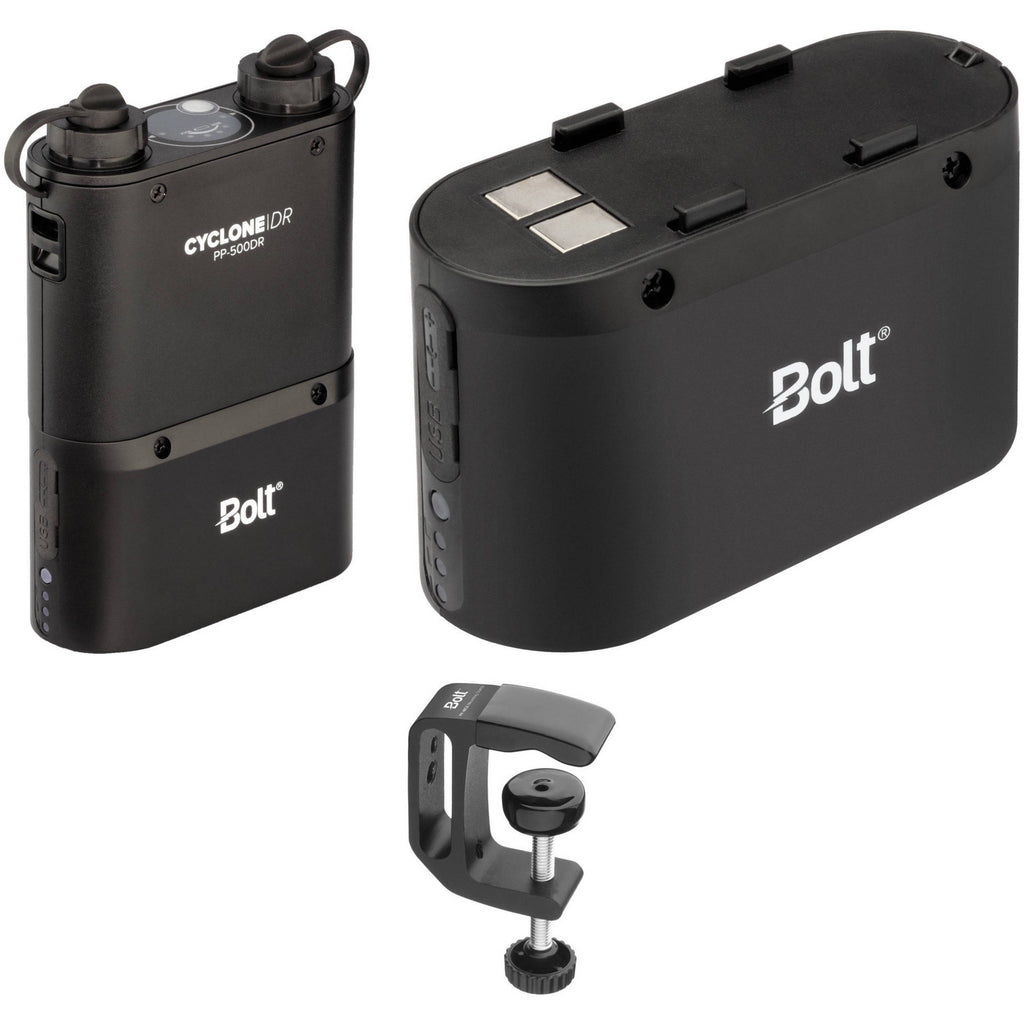 Compatibility Bolt PP-400DR and PP-500DR. Capacity The battery pack provides up to 2700 full-power flashes. Portability The battery is compact enough to be portable and interchangeable and can be recharged while shooting with another battery pack and provides consistent power throughout. Rechargeable The lithium-ion battery doesn't have to be completely drained of its power because it does not have a memory effect, so it is rechargeable at any time during its use. Stand-Alone Charger The battery pack delivers 5V of USB output power, which charges a smartphone or tablet without being connected to a Cyclone Power Pack. UPC: 847628002333 Bolt PP-MCX Mounting Clamp for Small Lights & Portable Power PackEasily mount your power pack to a light stand or attach a multitude of other items where you need them by using the versatile PP-MCX Mounting Clamp from Bolt . The clamp opens from 0.1-1.8" for use on light stands, tables, desks, doors, and other flat surfaces and it features a belt clip slot that allows users to easily hang their power pack. On the back two 1/4"-20 threads at different angles and one 3/8"-16 thread are available for mounting lights and other accessories. To prevent damage, the clamp features a rubber coating and it has the ability to hold up to 2 lb of gear when attached to a light stand or 8 lb on a flat base.