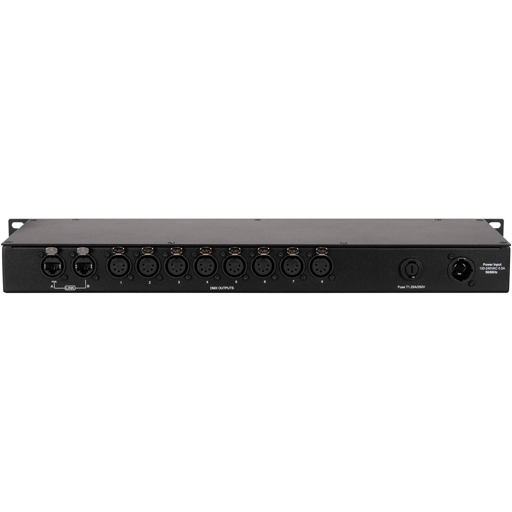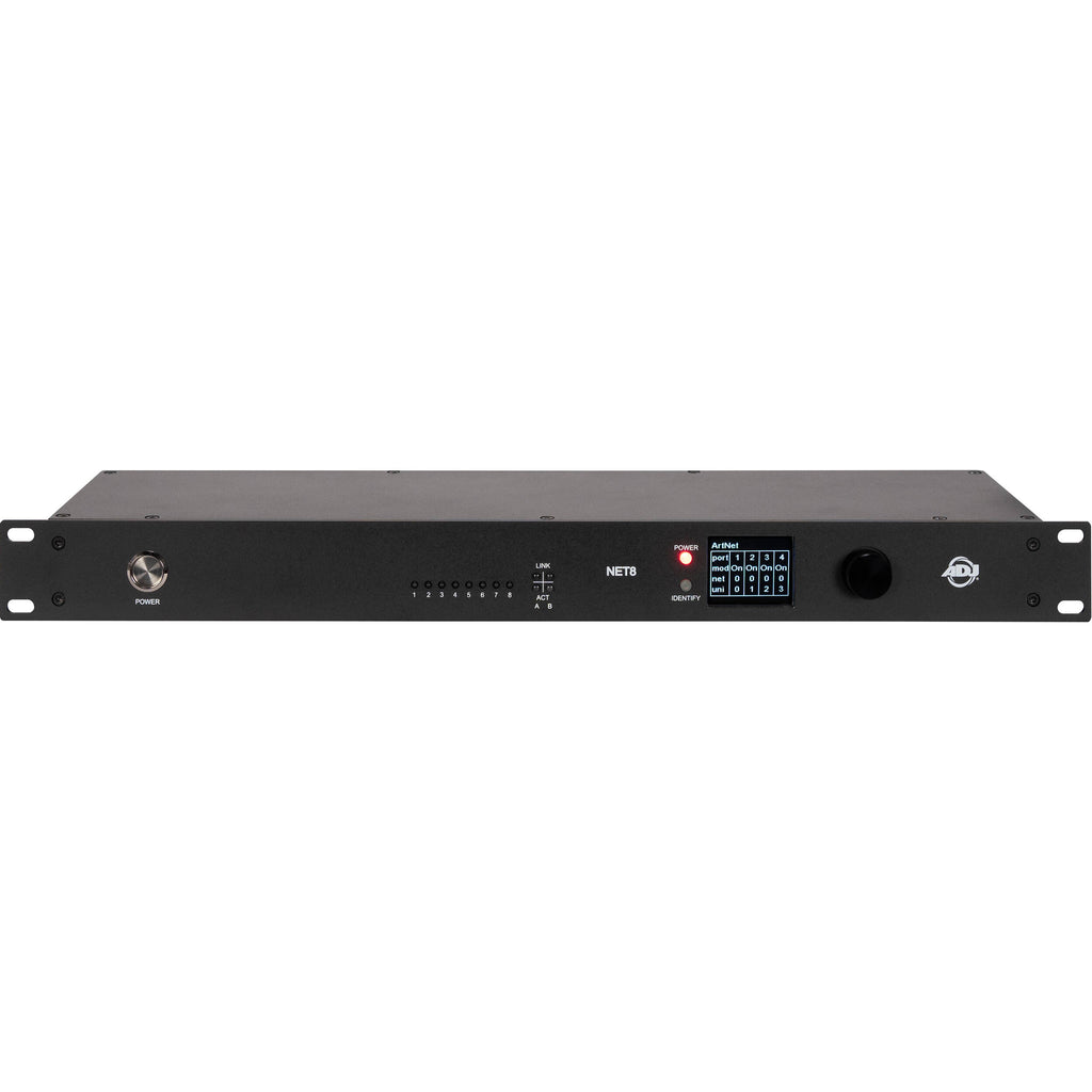 Experience a new level of dynamic lighting setups with the NET 8 DMX Over Ethernet Node from American DJ. The NET 8 supports all the industry-standard protocols, including Art-Net, sACN, DMX, and RDM to expand your integration possibilities. The eight 5-pin XLR ports can be configured as inputs or outputs. The NET 8's intuitive interface features a 1.7" LCD for onboard adjustments, but control is also possible from a web browser. Highly versatile to suit various applications, power options include traditional AC input or Power over Ethernet (PoE). The unit can be mounted within a 19" rack case.