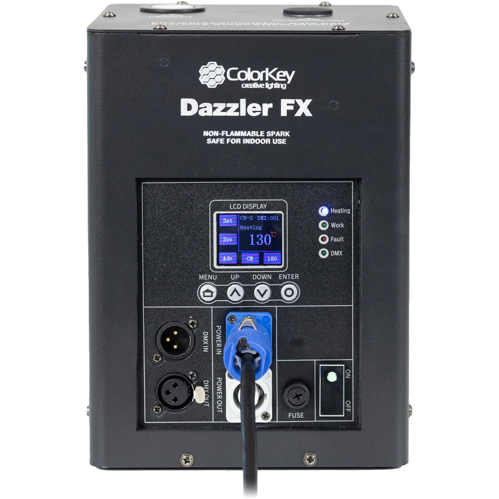 Produce geysers of shimmering spark effects with these ColorKey Dazzler FX MK2 Cold Spark Machines. This cold spark system includes two fixtures that produce dazzling fountains of shimmering sparks up to 15' high. These nonflammable cold spark fountain systems are safe for indoor use at virtually all your live events.