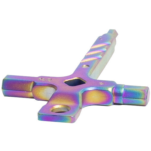Add this Multifunctional Allen Wrench & Slotted Screwdriver from DigitalFoto to your production kit. This cross-shaped metal tool features an Allen wrench to tighten M3, M4, and 3/16 Allen-style screws. The top of the wrench features a hole that allows you to hang it on a chain, rope, or key ring.