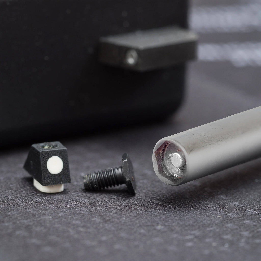 Use this Front Sight Tool for Glock from Fix It Sticks to install or remove the front sight on your Glock pistol. Machined from a single steel bar stock, it is compatible with any standard 1/4" bit driver. For best results, you should use it with the optional Fix It Sticks 6 in-lb Torque Limiter. The 3/16" Hex thin wall nut driver has an integrated magnet to hold the screw securely in place.