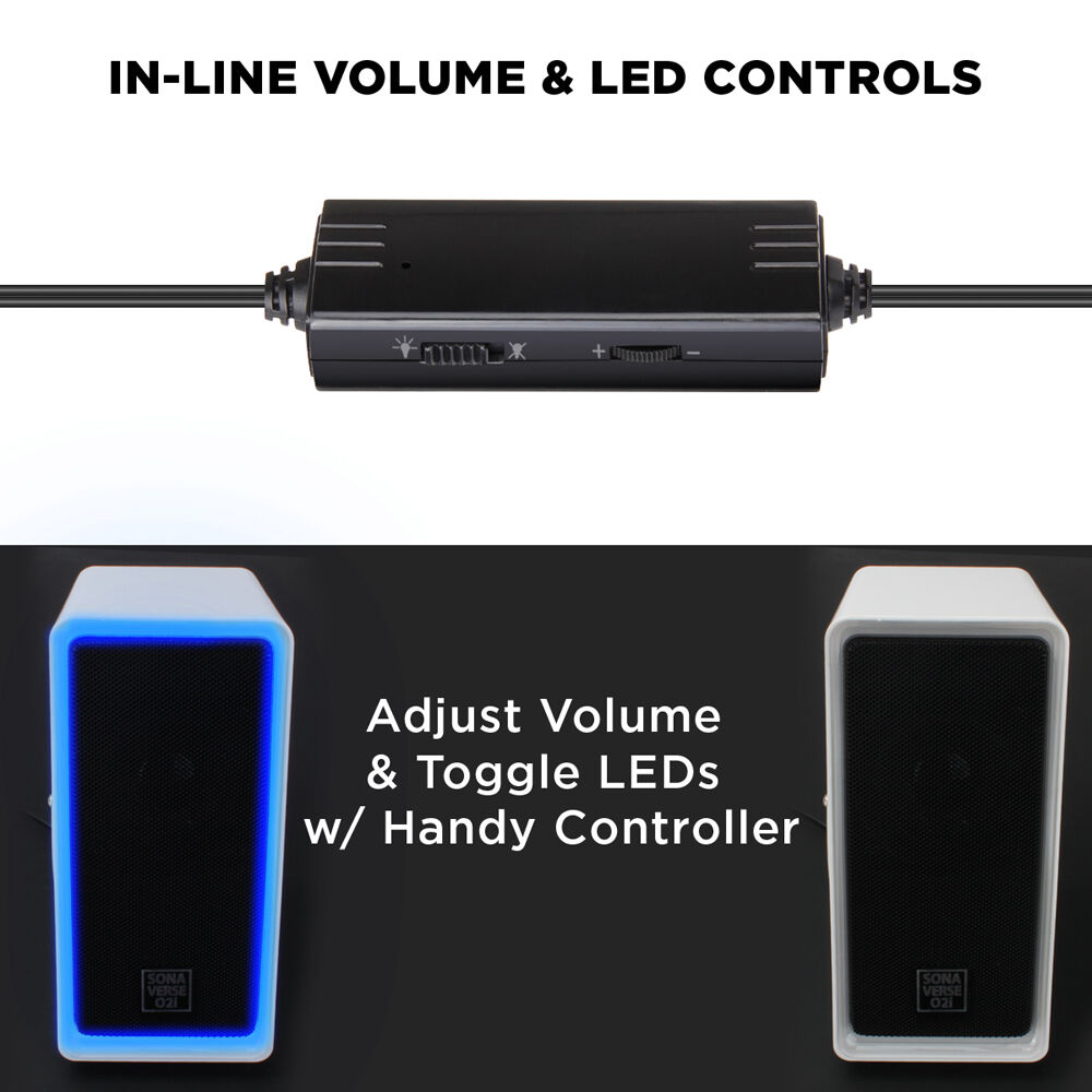 Light up your audio the SonaVERSE O2i Computer Speakers from GOgroove. This 2-channel speaker system features a 2" full-range driver and passive bass woofer in each speaker. Take advantage of 7W RMS and 14W of peak power for ample volume when gaming, listening to music, or watching your favorite shows. Bus powered, the O2i connects to a USB-A port on your computer or an AC adapter, available separately. The 3.5mm audio input cable allows for hassle-free plug-and-play connectivity. Adjust volume and LED lighting with the integrated controls.