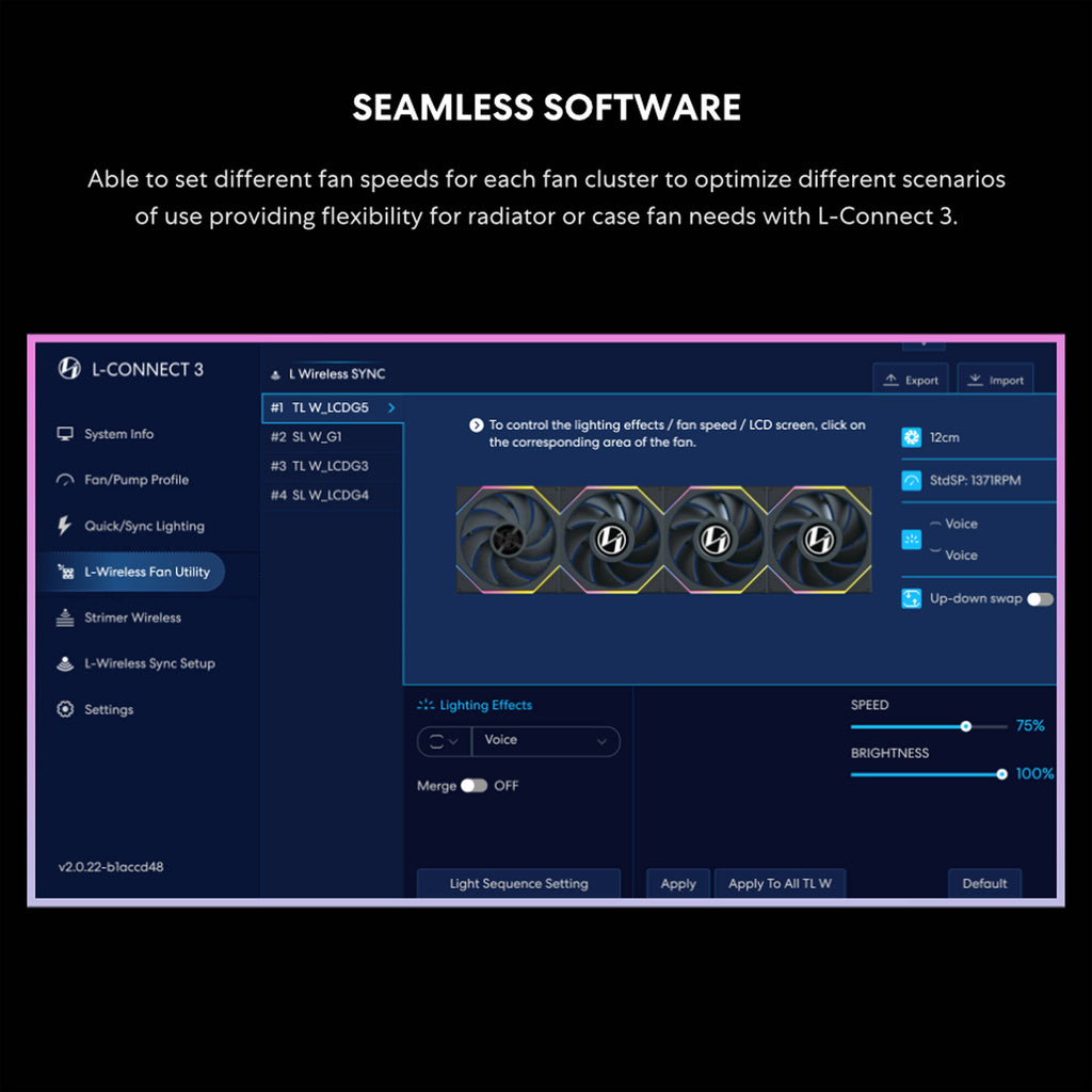 In addition to featuring a reverse blade design, you can daisy chain multiple UNI FAN TL Wireless fans by sliding them together, which allows you to mix and match between different styles. Use the L-Connect 3 software to manage fan speeds, RGB lighting effects, and more.