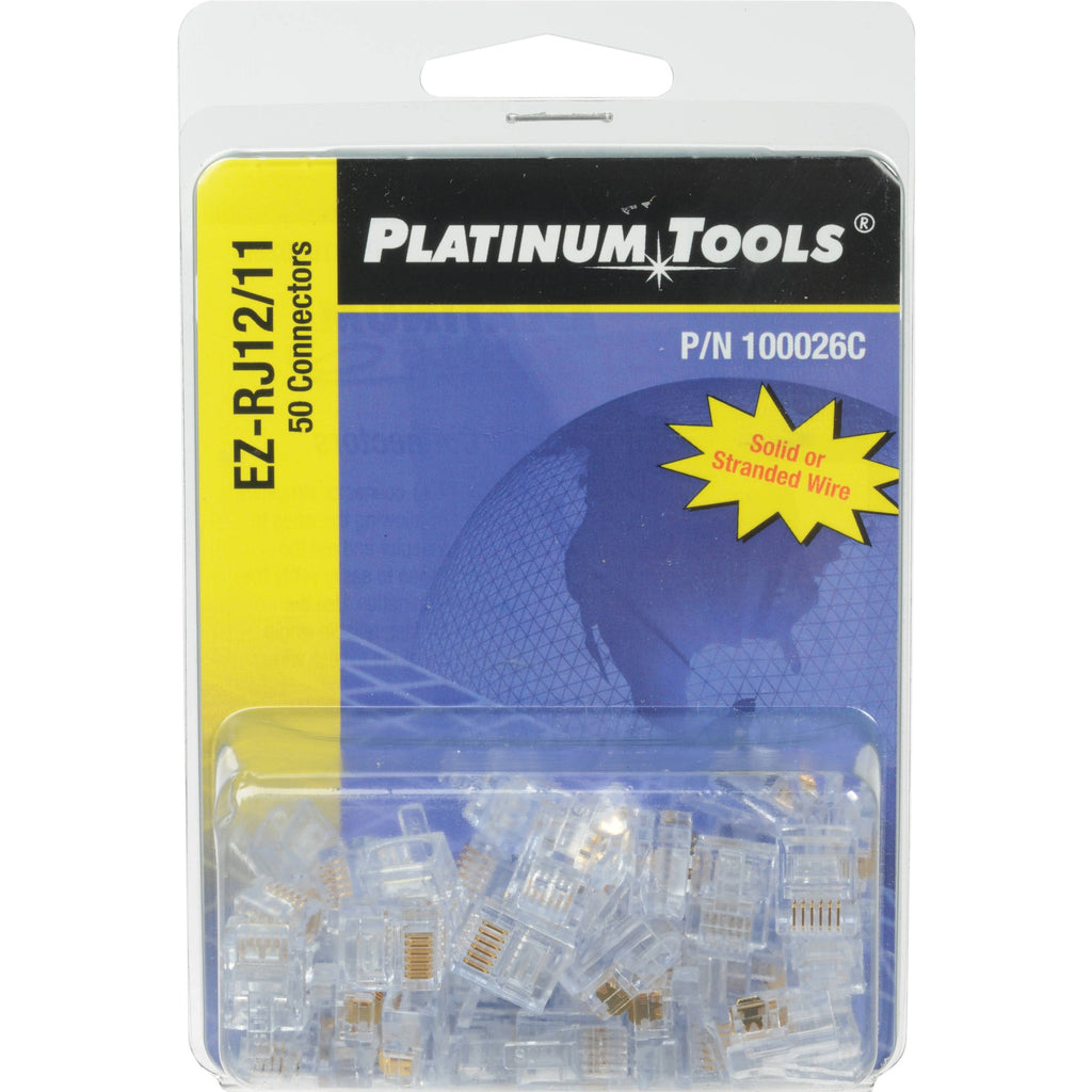 The Platinum Tools EZ-RJ12/11 Connector with Standard Tab , available in a clamshell-wrapped pack of 50, lets you terminate your solid and stranded wires so you can create RJ12 or RJ11 cables for telephone and security installations. To simplify twisted-pair terminations, each connector features an EZ pass-through design that allows you to insert the wire through the connector and out the front. This design also enables you to verify the proper wiring order before you crimp.