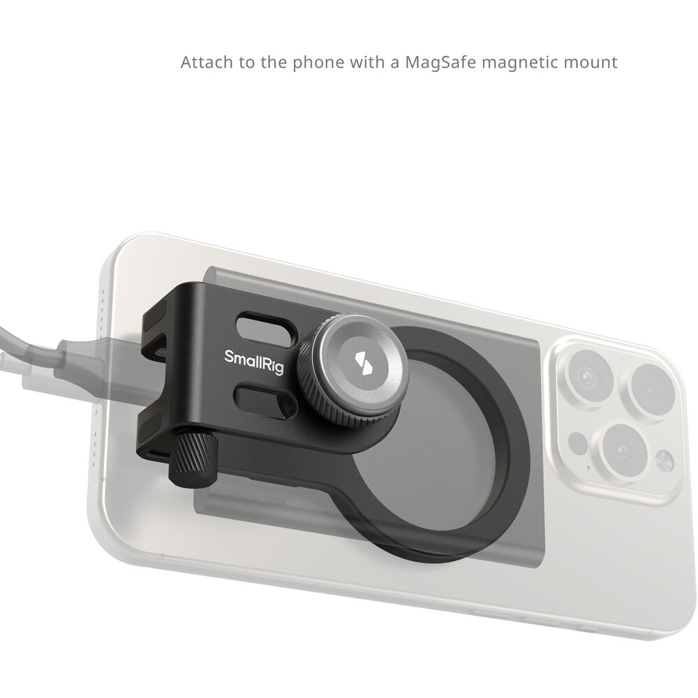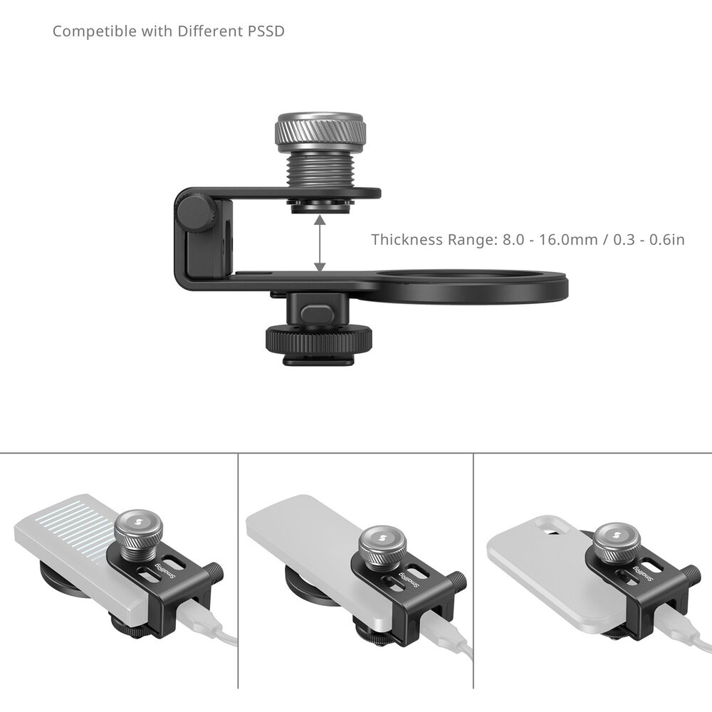 Firmly secure your SSD on your camera, smartphone, or camera cage using this MagSafe/Cold Shoe Universal 2-in-1 SSD Holder from SmallRig. This lightweight mount features a spring-loaded clamp that adjusts to mount an SSD with 0.3 to 0.6" thickness such as a Samsung T9, T7, or T7 Shield onto a smartphone or cage/camera shoe mount. The clamp features a soft silicone interior to prevent scratches.