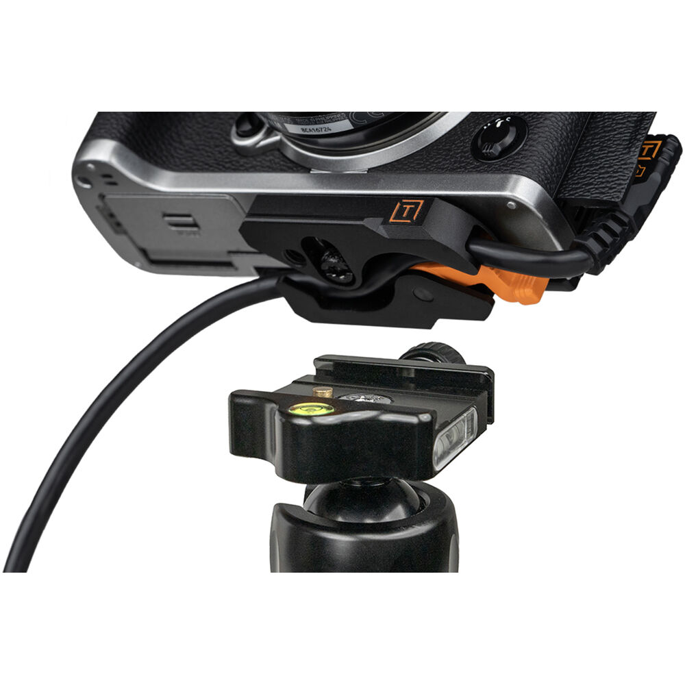 An elegant solution for tethered shooters, the TetherGuard LeverLock Plate from Tether Tools secures tethering cables to your camera while managing their footprint. The black Arca-Type compatible plate safeguards and simplifies the cable-camera connection by allowing the cable to be connected and removed without removing the plate. The cable passes through an S-channel in the bottom of the plate, where it is locked in place by the device's 5-point protection system. The plate has both a 1/4"-20 screw and a 1/4"-20 thread, making it compatible with almost any tripod and fits cables up to .26" in diameter.