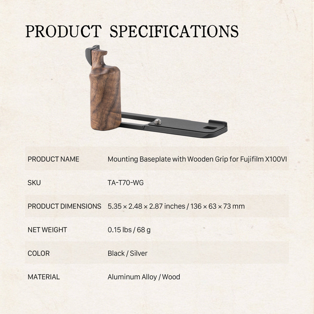 The Mounting Baseplate with Wooden Grip for the FUJIFILM X100VI camera is a handsome, custom-designed accessory ideal for photographers seeking improved comfort, control, and style. Crafted with an aluminum alloy base and a walnut wooden handgrip, its lightweight construction provides a secure and ergonomic grip. The baseplate is compatible with Arca-type quick release plates, allowing seamless attachment to Ronin S Series gimbals and lightweight tripods like the VT-05 Travel Fluid Head. The baseplate comes with a leather shoulder strap buckle and an accessory kit with screws and Allen keys.