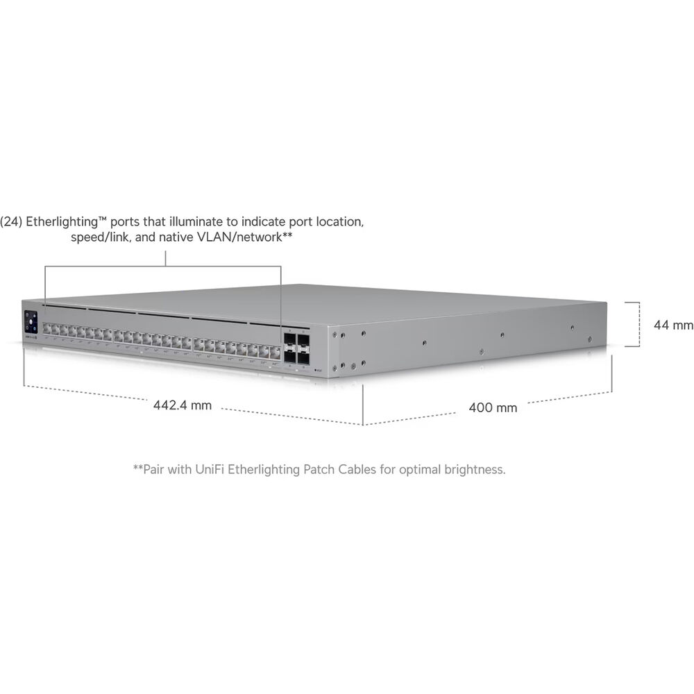Etherlighting technology illuminates each port to indicate the port location, speed/link status, and native VLAN/network configurations when used with compatible cables. A 1.3" touchscreen display provides important status information at a glance. Supporting a 230 Gb/s (115 Gb/s non-blocking) switching capacity, 171 Mpps forwarding rate, and Layer 3 features, the Pro HD 24 delivers smooth data transfers.