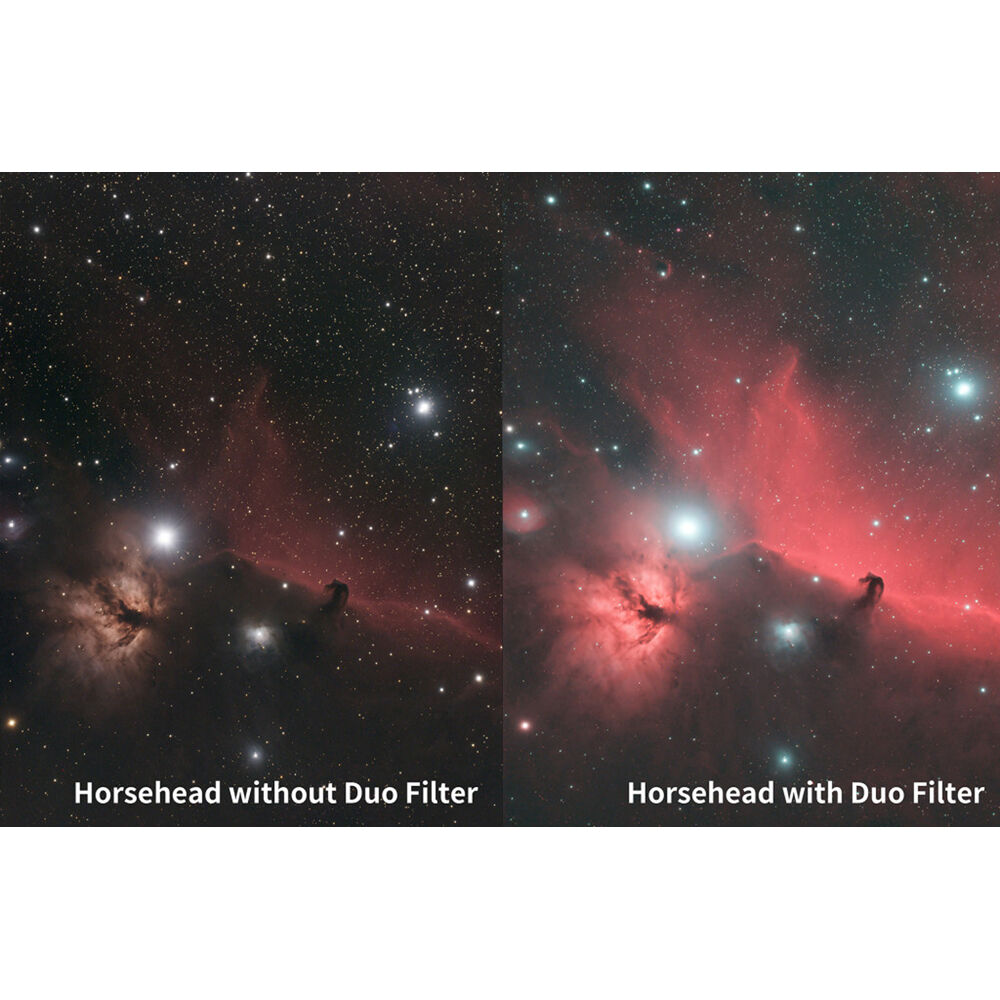 The 2" ZWO Duo-Band Filter passes light in the hydrogen-alpha (656.3nm) and O-III (500.7nm) wavelengths. It improves contrast and seeing for deep space objects such as emission nebulae, and can be used to filter out moonlight or urban light pollution. With a one-shot color astronomy camera, it allows use of narrowband techniques that normally require a monochrome camera, filter wheel, and narrowband filters. The Schott-substrate glass is 1.85mm thick, optical-coated on both sides, and mounted in machined metal with engraved lettering.