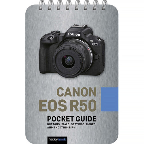 Grab a copy of the Canon EOS R50: Pocket Guide by Rocky Nook to step up your Canon photography. This 42-page spiral-bound notebook serves as a handy quick-reference guide for button layout, shooting modes, and features for the Canon R50 mirrorless camera.