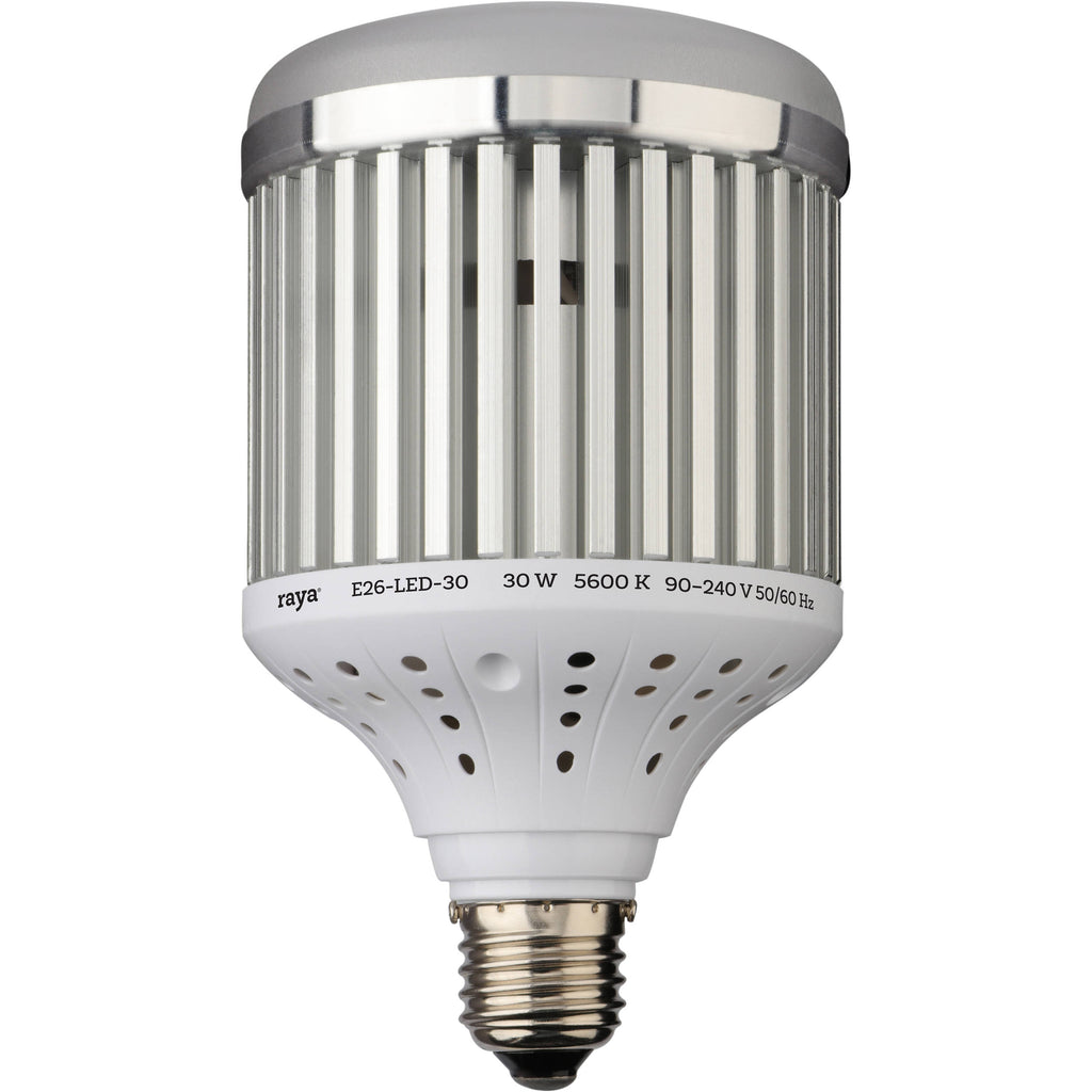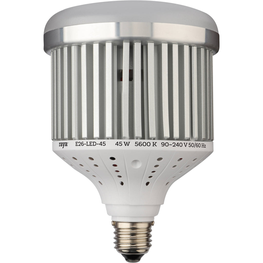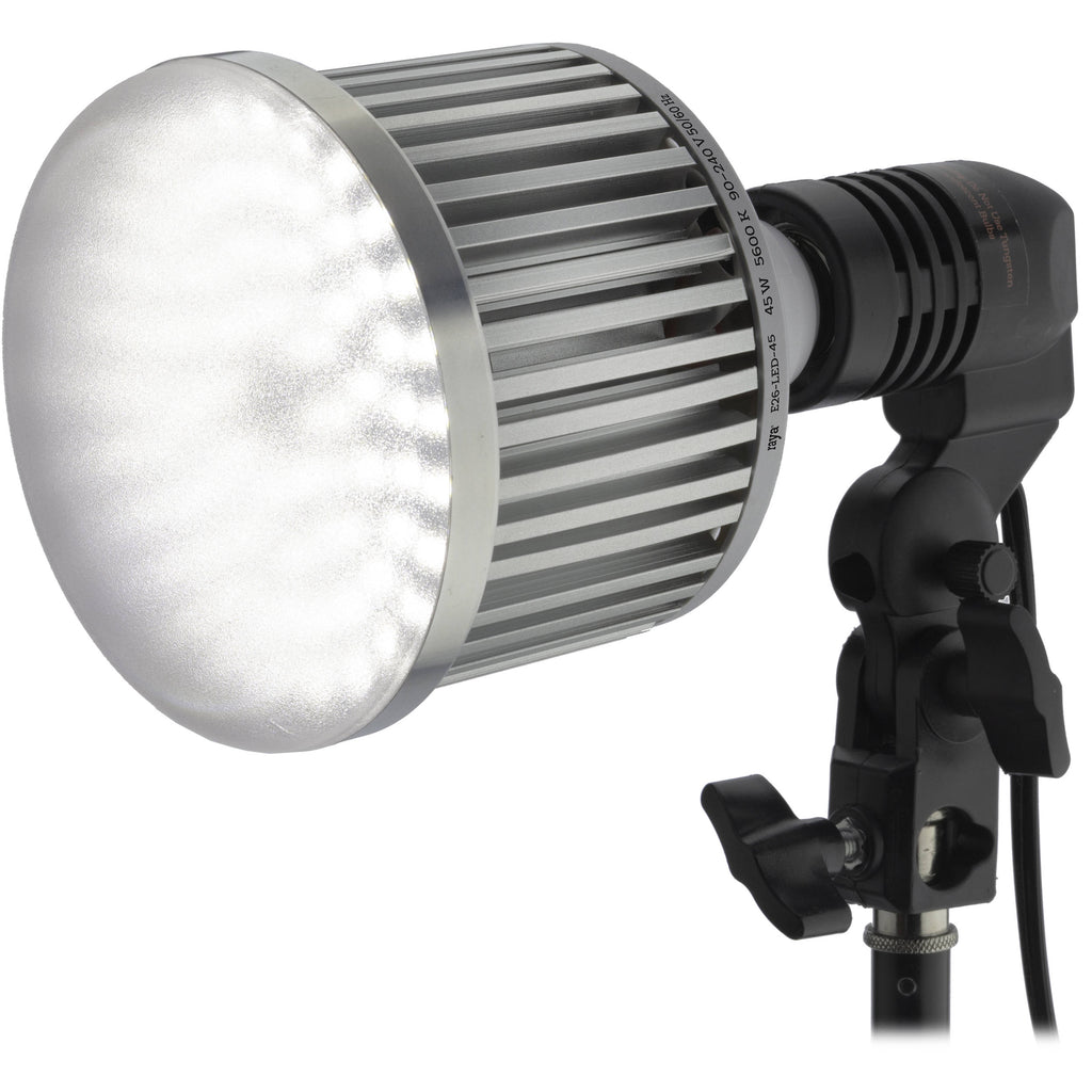 Ideal for photography and videography, the 45W LED Light Bulb from Raya outputs a bright 1200 lux at 3' and has a daylight-balanced color temperature of 5600K with high CRI/TLCI ratings of 96.1 and 94.6, indicating superior accuracy in color reproduction. Although it generates negligible heat, what little it does is dissipated by the light's fan-less aluminum heat sync that not only extends its life to 50,000 hours, but also keeps your subject cool and comfortable and is a valuable asset in sound-sensitive environments. The light is 90 to 240VAC compatible for worldwide use and has an E26/E27 Edison base (sometimes called household) that will easily screw into this extensively-used socket.