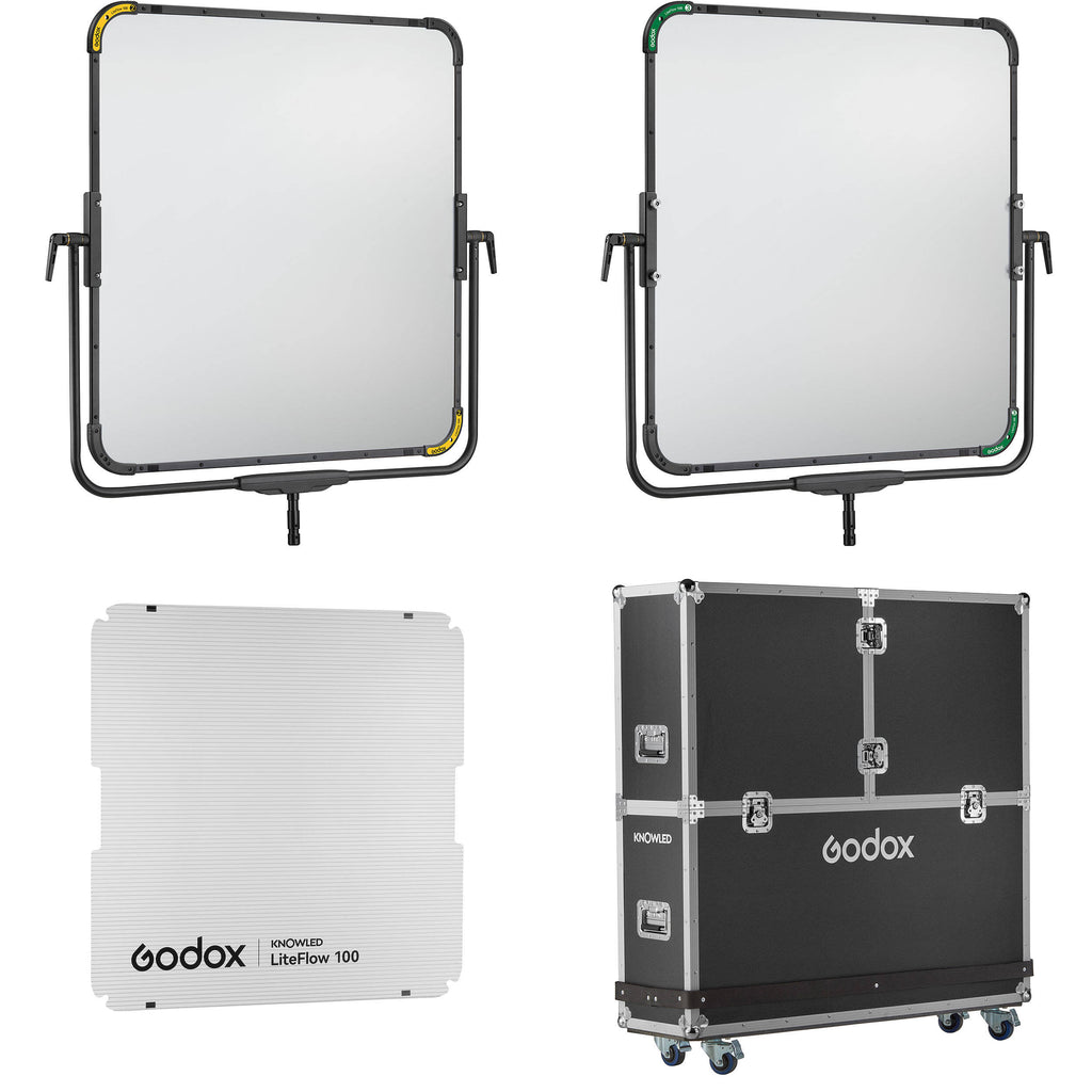 Designed as a unique solution to create indirect light, Godox introduces the KNOWLED LiteFlow 100 Double-Sided Reflector � featuring two versatile mirror-like reflector boards with varying diffusion strengths mounted on two durable yoke frames. While other similar reflectors have been used for years, Godox's cutting-edge reflection system accurately guides the light source to your desired positions. Made to cover a variety of environments and applications, the two 40 x 40" double-sided reflectors sport different diffusion levels, ranging from a hard to a soft strip ray of light. This kit also includes a robust flight case for storage and portability.