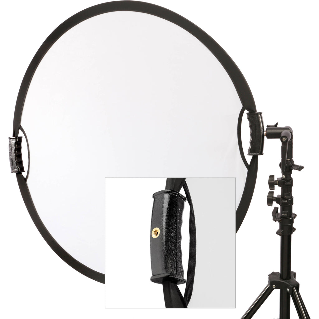 This two-handle 42" Soft Gold/White Circular Collapsible Reflector from Impact �adds a polished-looking quality of light to your photos or videos. The reflector's convenient features make it easy to use and deliver impressive results. The reversible reflector folds down to approximately one third of its open size. Impact's smart design provides ergonomic handgrips that allow you to hold the reflector in a flat or U-shaped position, or in any way that gets the job done. Each of the grips have additional 3/8"-16 threaded sockets for attachment to accessories or grip equipment. This reflector provides two surfaces that are very flattering to your subject. The Soft Gold side of the reflector is a mixture of silver and gold that adds gentle warmth to the image and improves quality. The White side provides soft, neutral fill light that's flattering to the subject.