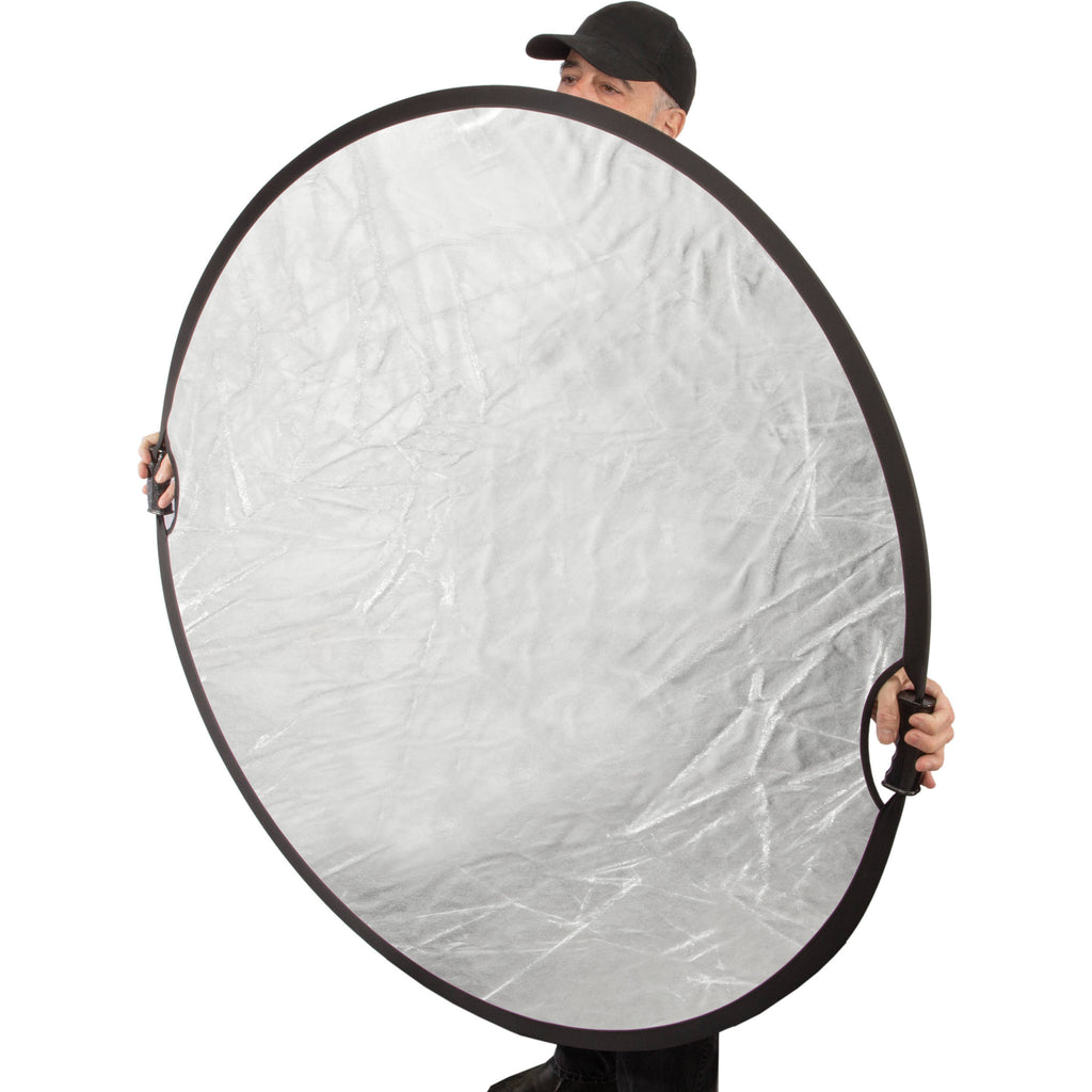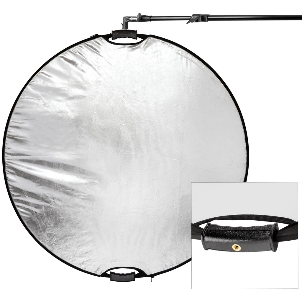 This two-handle 52" Gold/Silver Circular Collapsible Reflector from Impact �adds a polished-looking quality of light to your photos or videos. The reflector's convenient features make it easy to use and deliver impressive results. The reversible reflector folds down to approximately one third of its open size. Impact's smart design provides ergonomic handgrips that allow you to hold the reflector in a flat or U-shaped position, or in any way that gets the job done. Each of the grips have additional 3/8"-16 threaded sockets for attachment to accessories or grip equipment. The Gold side of the reflector adds noticeable warmth to the image; reminiscent of late day sun or sunset. It's useful for balancing the blue that's evident in open shade. The Silver side provides bright, snappy contrast and a cool color bias.