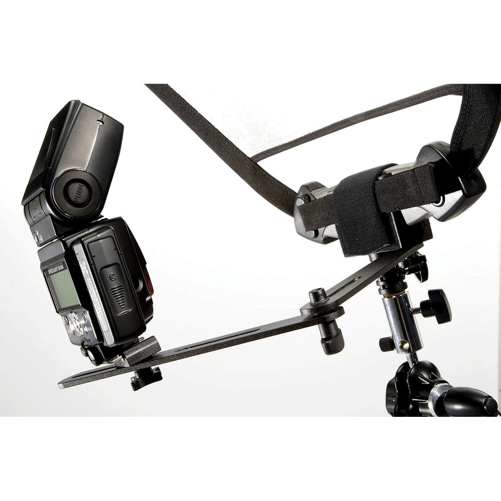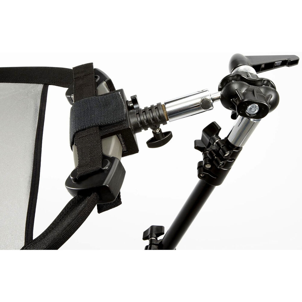 The Manfrotto Trigrip Holder with Flash Bracket is an ideal accessory for shooting on the run. Functioning much like a photo assistant, the bracket holds an on-camera flash on a swing-away arm at one end and the molded Trigrip reflector or diffuser handle, secured with a strap at the other. The integral ball-joint is then employed to achieve the desired angle for the desired bounced or diffused lighting effect. The attaches to a standard 5/8"(16 mm) light stand stud.