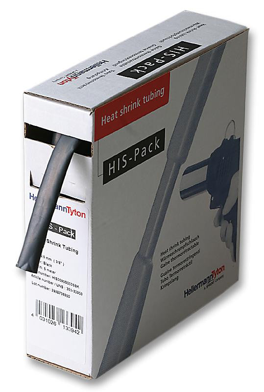 This is a Heat Shrink Tubing, HIS-PACK Dispenser, 9.5 mm, 0.374 ", 2:1, Black, 16.4 ft, 5 m product from HELLERMANNTYTON with the model number 300-30950