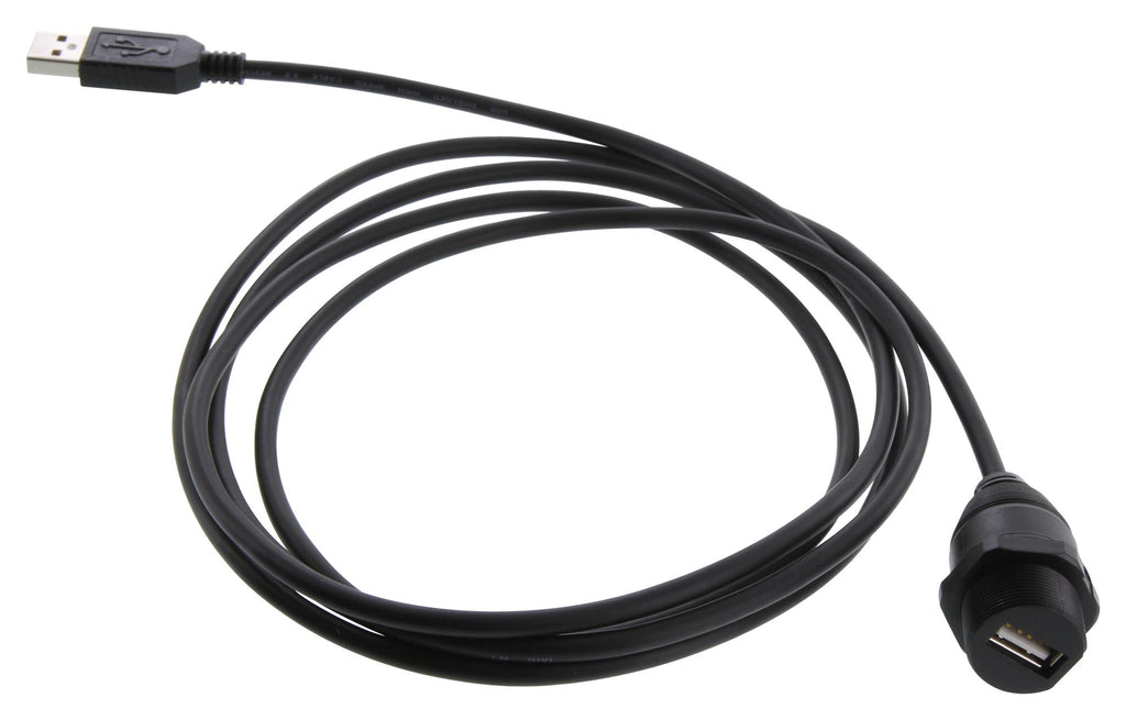 - Waterproof panel mount USB A female to standard USB A male connectors, revision 2.0 compliant