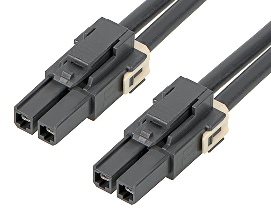 Off-the-shelf Mega-Fit single row cable assemblies deliver a 25A current rating and offer a variety of cable lengths with a compact connector to support both prototyping and global production. Polarizing and unique keying features provide protection of the terminals in the receptacle, allow for compatibility with all current Mega-Fit single row headers and prevent electrical arcing when charged. New latch with grip steps provides superior retention. Individually polarized header helps prevent electrical arcing and helps support the keying feature. New latch design provides superior retention when mated to the header and allows for low-mating force. Typical applications include commercial vehicles, home appliances, industrial and telecommunications/networking.