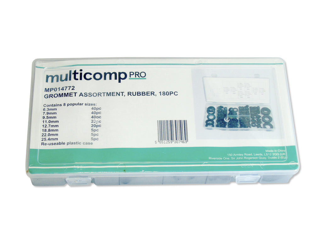 MP014772 is a practical 180-piece Rubber Grommet Assortment, featuring 8 popular sizes ranging from 22mm to 25.4mm. Designed for various applications, these grommets offer a secure and organized solution for cable management. The re-sealable plastic case provides easy access and helps keep your workspace clean and organized.