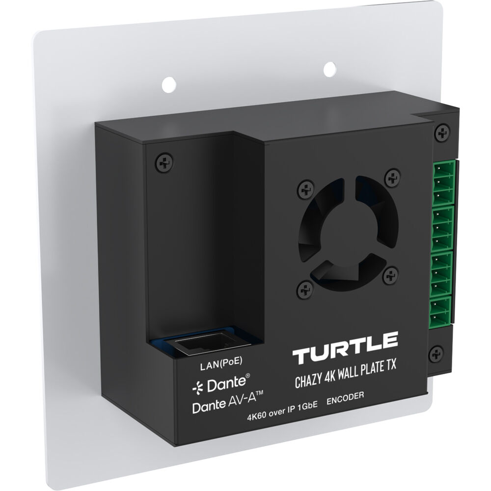 The CHAZY 4K Wall Plate TX from Turtle AV is a Dante AV-A and JPEG 2000 encoder that fits inside a standard 2-gang wall box. This 2-gang Decora-style wall plate features a variety of input and output ports, allowing seamless transmission of 2160p60 Hz 4:4:4 HDR video from laptops or tablets via USB-C and from video sources via the HDMI 2.0b input. It includes the Dante AV-A license, which also has a 2 x 2 Dante audio license. PoE powered and supporting a wide range of audio formats, including 7.1 Dolby Atomos, the transmission wall plate features advanced capabilities like KVM, video wall configurations up to 9 x 9, hardware scaling, EDID management, HDCP 2.2, and true multicast support.