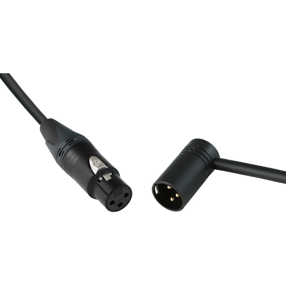 The 15' cable is terminated with a straight XLR-3 female Neutrik XX Series connector (with a black ring) at one end and a low-profile, right-angle XLR-3 male connector (with a black cap) at the other. You can adjust the low-profile XLR cable outlet orientation to fine-tune it to your exact needs with a 120° swing.