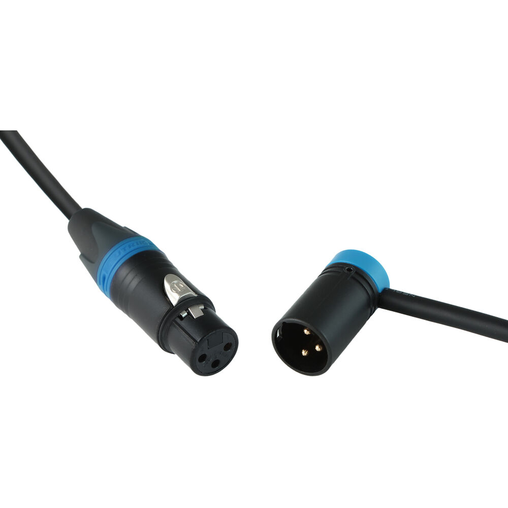 The 3' cable is terminated with a straight XLR-3 female Neutrik XX Series connector (with a blue ring) at one end and a low-profile, right-angle XLR-3 male connector (with a blue cap) at the other. You can adjust the low-profile XLR cable outlet orientation to fine-tune it to your exact needs with a 120° swing.
