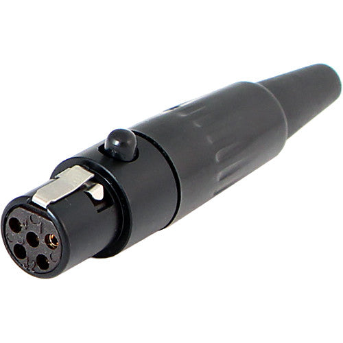The black Cable Techniques TA5F 5-Pin Female Mini-XLR Connector is a TA5F connector designed to be attached to an interconnect cable for use with lavalier microphones and portable mixers in ENG, field recording, and television production. It features a 5-pin female mini-XLR end with gold contacts and a standard cable outlet.