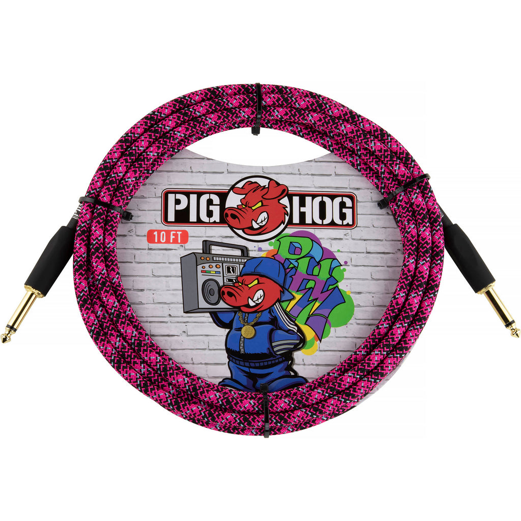 Glam up your next audio project with the 10' pink graffiti Pig Hog Vintage Series 1/4" Instrument Cable. This gold-plated 1/4" audio cable is made with a high-quality pink graffiti 7mm woven jacket to resist kinks and tangling while coiling and deploying. Pig Hog's proprietary OFC conductor technology and robust shielding ensures clear audio. Every cable is manufacturer hand-tested before shipping. The cable has a straight 1/4" audio connector at each end.