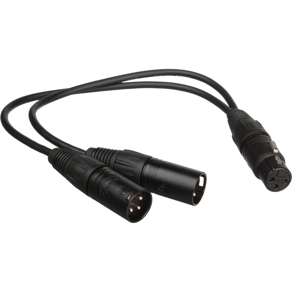 This Hosa XLR Female to 2 XLR Male Y-Cable is an 8" Y-cable for audio applications.