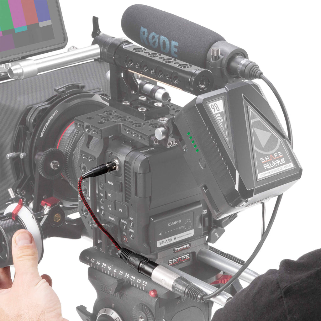 The 9" Mini XLR Male to XLR Female Cable from SHAPE is designed for cameras that have a 3-pin XLR input, including the Canon C70 and Blackmagic Pocket 4K and 6K cameras. It allows you to connect a microphone or audio mixer to the camera, and it supports 48V phantom power for compatibility with standard 3-pin XLR mics.