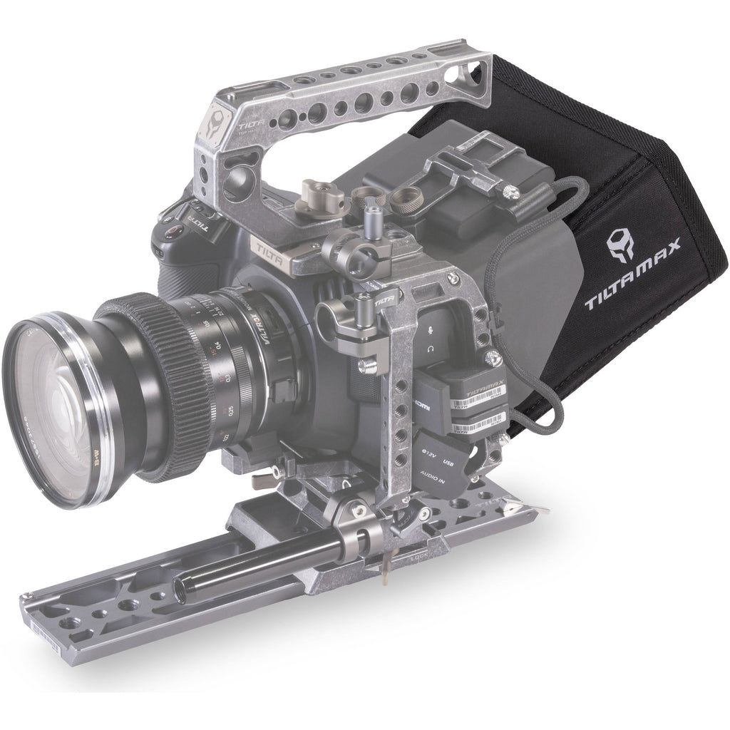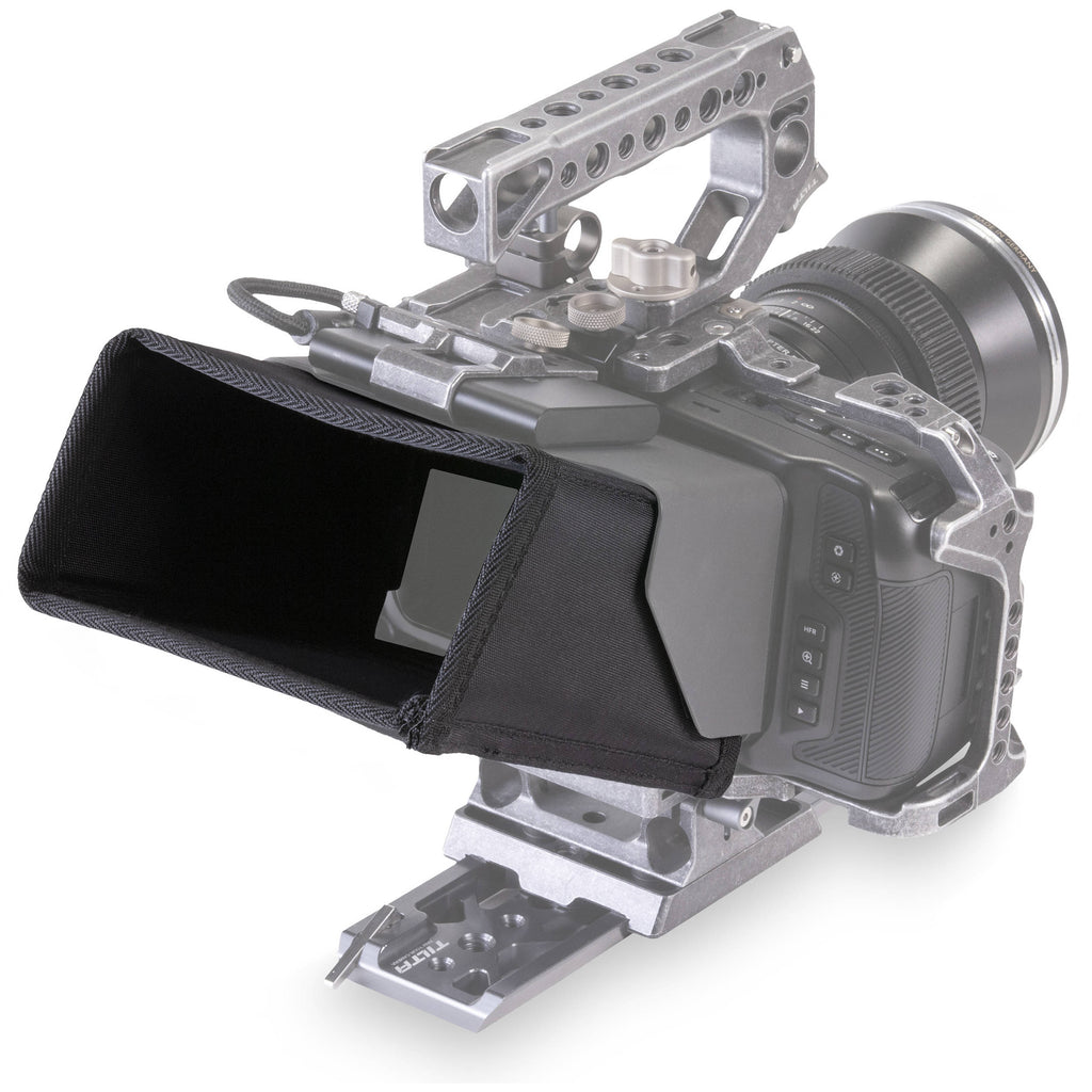 Protect the LCD screen on your Blackmagic Design Pocket Cinema Camera 4K from glare with this Tilta Full Sun Hood . The hood is made from black nylon and attaches to the Half Sun Hood for BMPCC 4K via the included hook-and-loop fabric. This extends the protection from glare and provides a better viewing environment, giving you greater sunshade coverage. Access to the camera's touchscreen is via a compartment on the bottom of the sun hood.