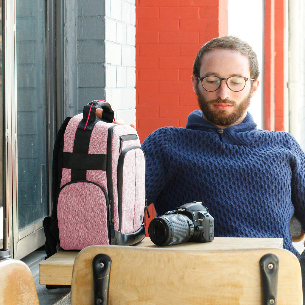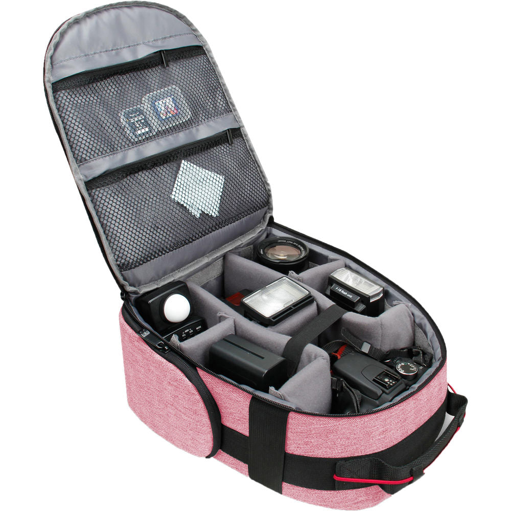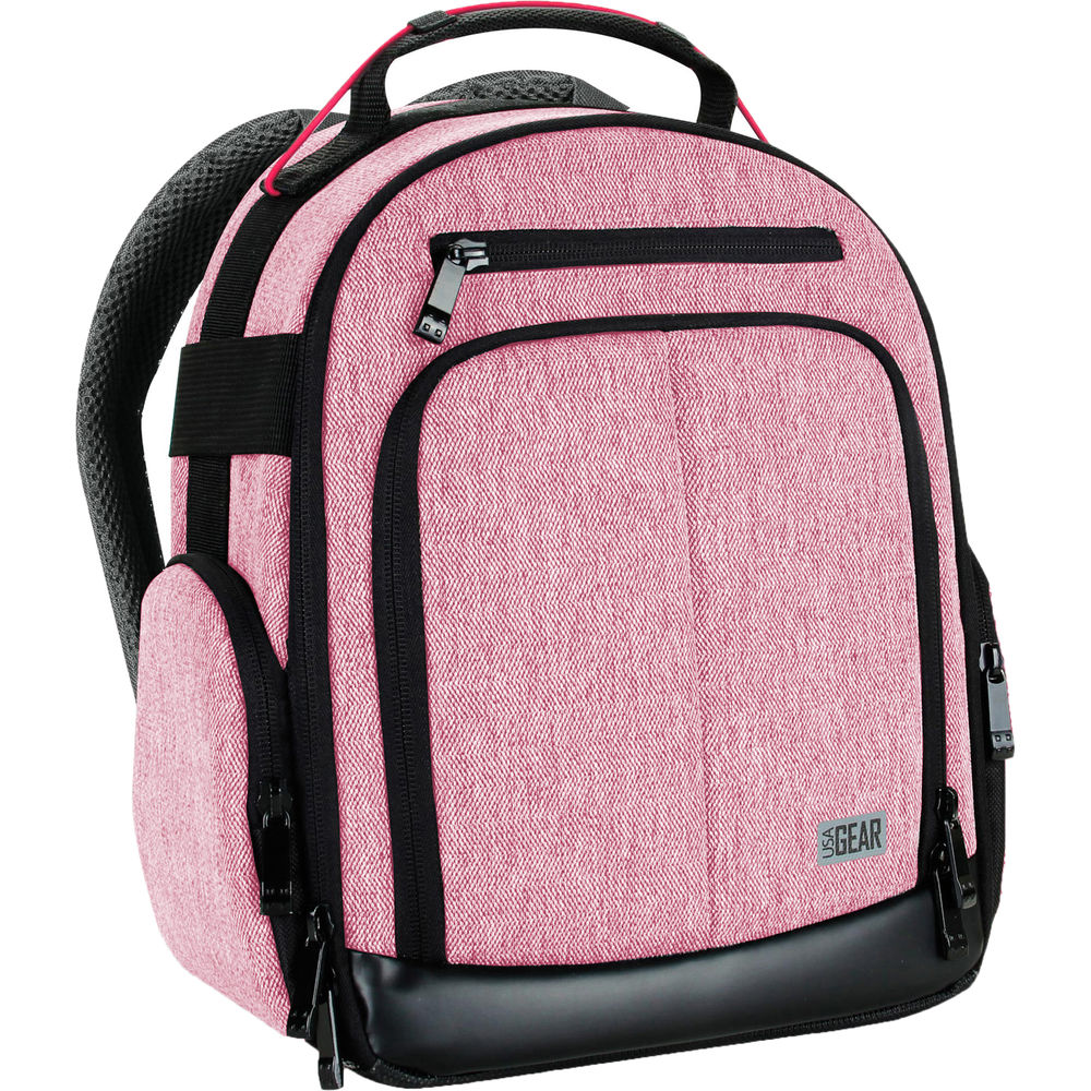 Store and protect your DSLR camera, lenses and accessories in the red USA Gear S17 DSLR Camera Backpack from Accessory Power . Touch-fastening padded dividers and eight accessory pockets provide numerous customized storage options. The top of the pack has a zippered compartment with an accessory pocket for keeping personal items and anything requiring handy access. A padded laptop compartment will accommodate a 15.6" notebook, tablet or other similar sized device.