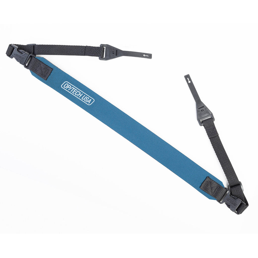 The navy Fashion Strap 2.0 with 3/8" Plastic from OpTech is made from neoprene that has been bonded on both sides with nylon for added strength and controlled stretch. This combination creates a weight-reduction system that makes your camera feel lighter and more comfortable to carry. This strap was made with adjustable connectors made of a thermoplastic-rubber that are 3/8" wide to fit most camera connection points.