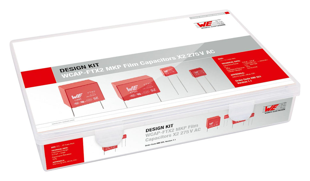 890334 is a X2, 310VAC, film capacitor design kit. Application includes safety applications, filtering, suppression, e.g. EMC filter for power supply.
