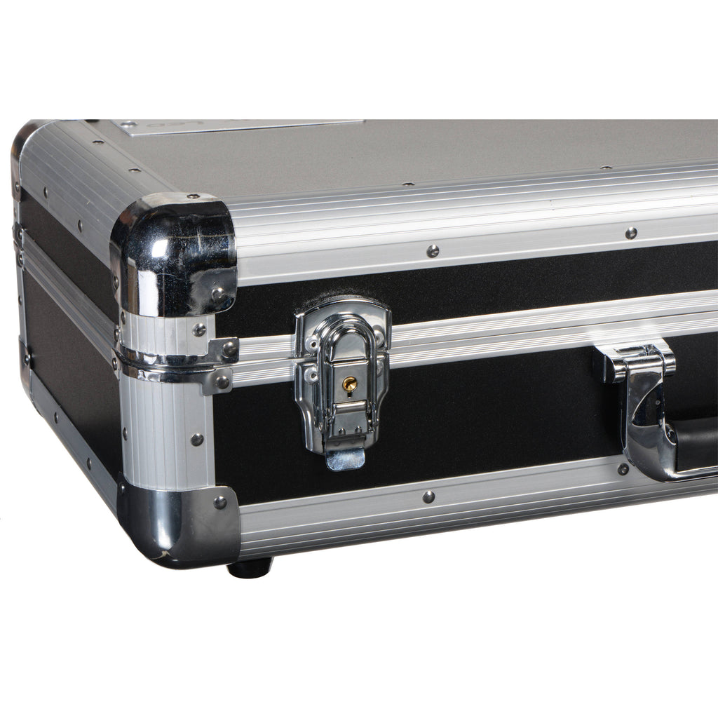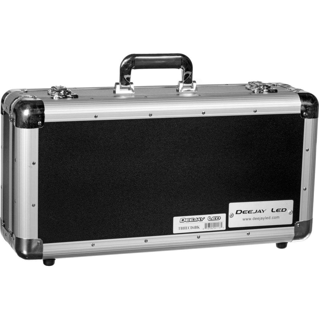 The black DeeJay LED 4-Row CD Case can hold 100 jewel cases and up to 200 plastic sleeves. This lightweight, yet durable case features a detachable hinged cover with two lock latches with keys, reinforced chrome-steel corners, a foam-padded interior, non-slip rubber feet, riveted construction, and a durable aluminum frame.