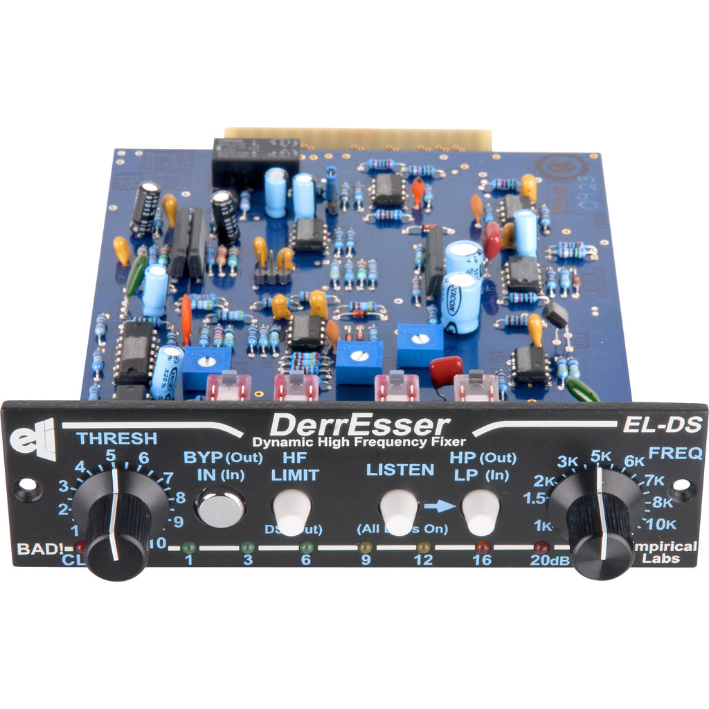 The DerrEsser ELDS-H from Empirical Labs is a horizontal multi-function dynamic filtering device, designed for API 500-Series enclosures. In its basic DS mode, it is an effective, level-insensitive de-esser, a device that will adjust the high-frequency gain on overly treble-y or spiky vocals or other sources in an extremely musical manner. However, unlike other de-essers, the device allows for multiple uses of its circuitry. As a de-esser in the DS mode (HF Limit OFF), the threshold can be set to tame harsh S's (sibilants) that result from an overly bright singer or from EQ'ing to make a vocal sound aggressive and clear. The DS threshold is not level dependant, and compares the amount of high-frequency content to the low-frequency content, so adjusting the overall level does not affect the threshold. It features VCA technology for glitch-free, distortion-free, and noise-free performance. The corner frequency is user adjustable with a high-performance active crossover.