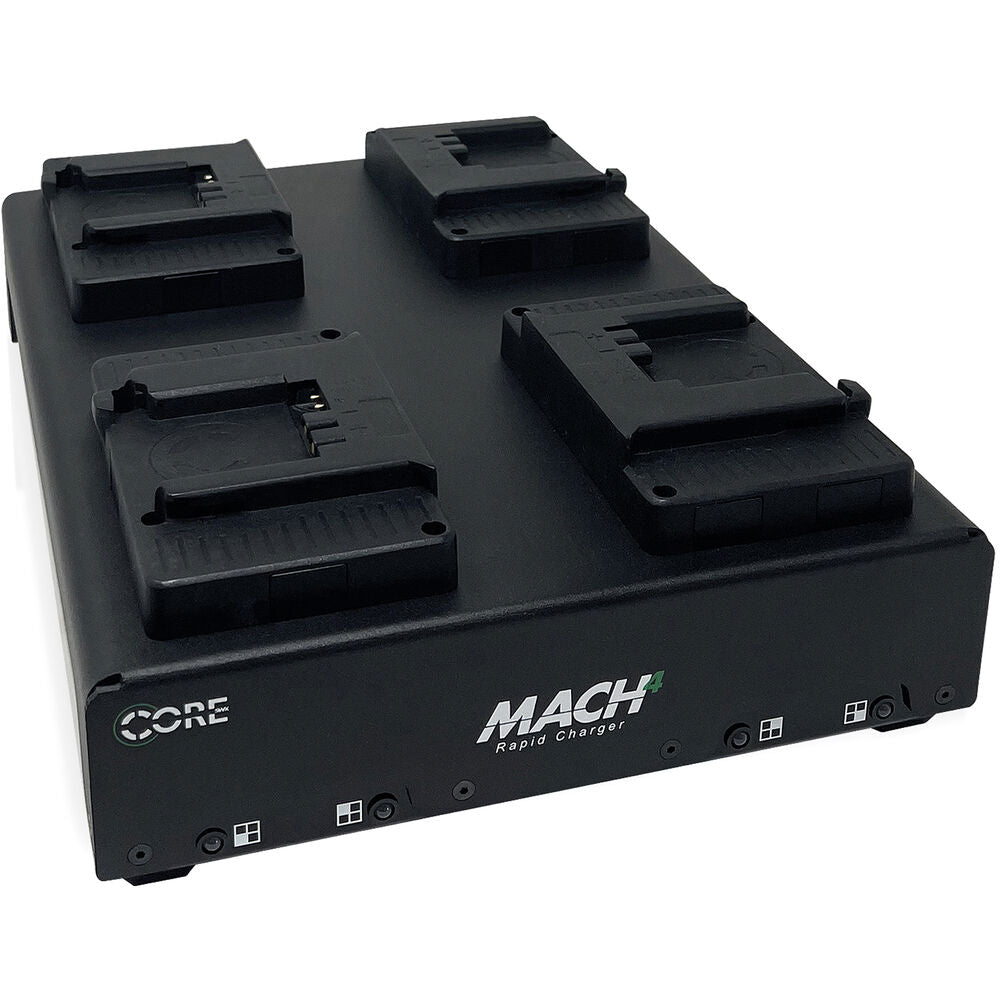 This Mach4 4-Position Battery Charger from Core SWX charges four 98Wh Helix B-Mount batteries simultaneously with a 4A quick charge current for full power in 90 minutes. Red and green LEDs indicate charging status for easy monitoring. The Mach4 supports 90 to 240 VAC input voltage for worldwide compatibility.