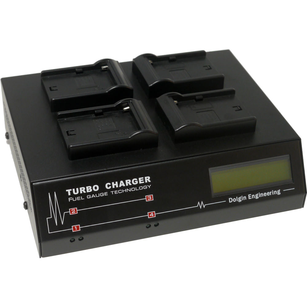 The Dolgin Engineering TC400 Four Position Battery Charger simultaneously charges up to 4 select Sony-type battery packs. It supports the following batteries: Sony NP-FM50, NP-FM500H, NP-FM55H, NP-FM70, NP-FM90, NP-FM91, NP-QM71, NP-QM71D, NP-QM91, or NP-QM91D batteries. It will charge batteries in approximately 2.5 hours, even when all 4 charging bays are filled. Additionally, each battery bay is independent, meaning that batteries can be added and removed at any time.