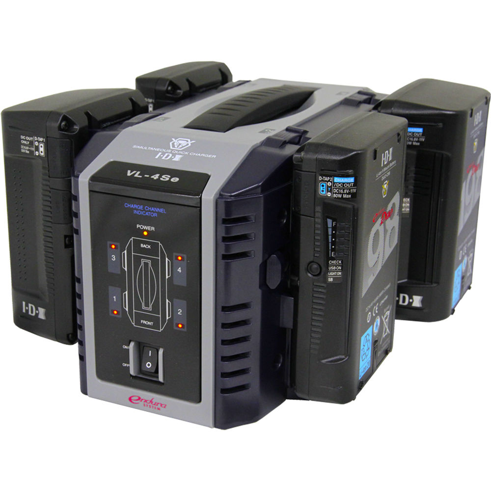 The IDX VL-4SE Endura 4-Channel Lithium-Ion Battery Charger charges up to 4 IDX Endura V-mount batteries at the same time. Each bay is independent of the others, so there is no waiting for one battery to finish before the next one can start. The charger features a durable yet lightweight polycarbonate body with a recessed power switch and a top handle. This V-mount charger is compatible with IDX's Endura series of batteries.
