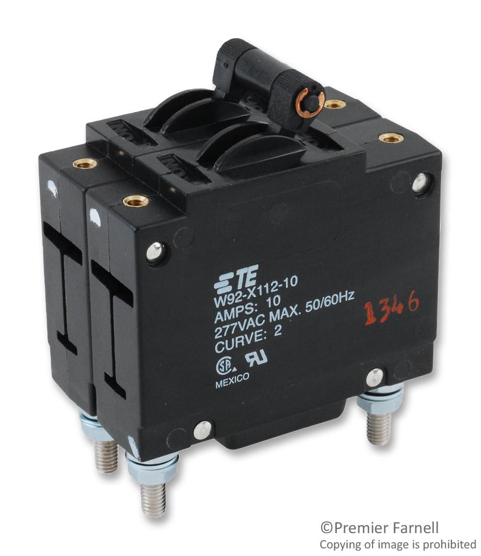 This is a CIRCUIT BREAKER, HYDROMAGNETIC, 2P, 277V, 10A product from POTTER&BRUMFIELD - TE CONNECTIVITY with the model number W92-X112-10