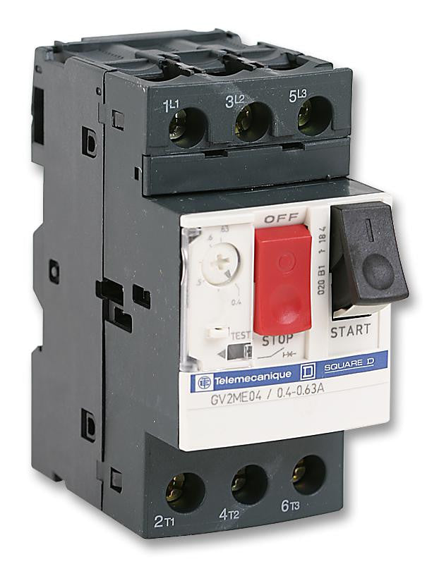 The GV2ME04 from Schneider is a TeSys three pole thermal magnetic circuit breaker with screw clamp terminals. This circuit breaker is approved by EN 60204, IEC 60947-1, IEC 60947-2, IEC 60947-4-1, NF C 63-120, NF C 63-650, NF C 79-130, UL 508, VDE 0113, VDE 0660 and CSA C22.2 standards. The GV2ME04 is DIN rail mountable with vertical and horizontal mounting positions.