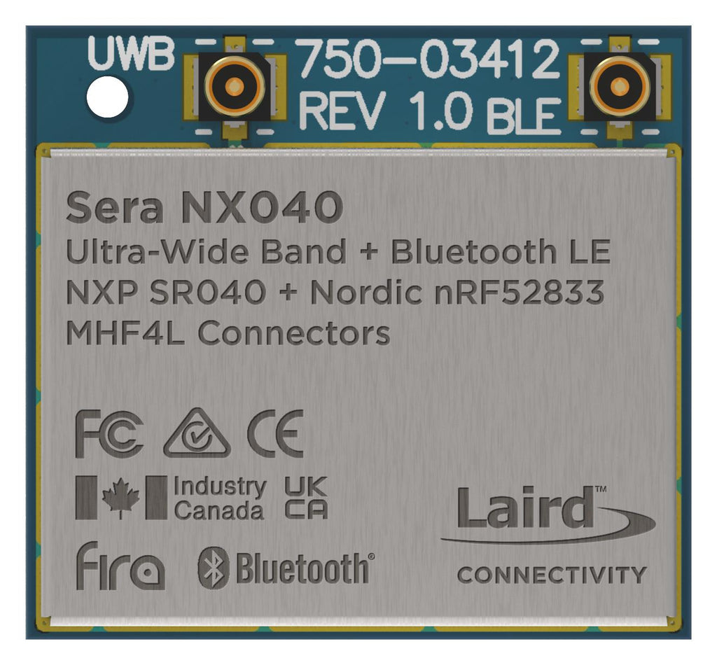 453-00174C is a Sera NX040 - UWB/Bluetooth LE module, MHF4L connectors. The time has come for Ultra-Wide Band (UWB) to grow beyond the consumer and automotive segments into mainstream IoT devices. The series features tightly integrated hardware and RF designs, all optimized for low-power operation and reducing the need for external clocks, filters and components. Already using Bluetooth LE for basic beaconing or RSSI-based ranging. Now, easily advance to the next level with NFC and UWB for more granular location and positioning. This granularity yields much higher accuracy compared to RSSI-only proximity applications in industrial environments. Typical applications include smart cities, indoor positioning/ RTLS, asset tracking, factory automation.