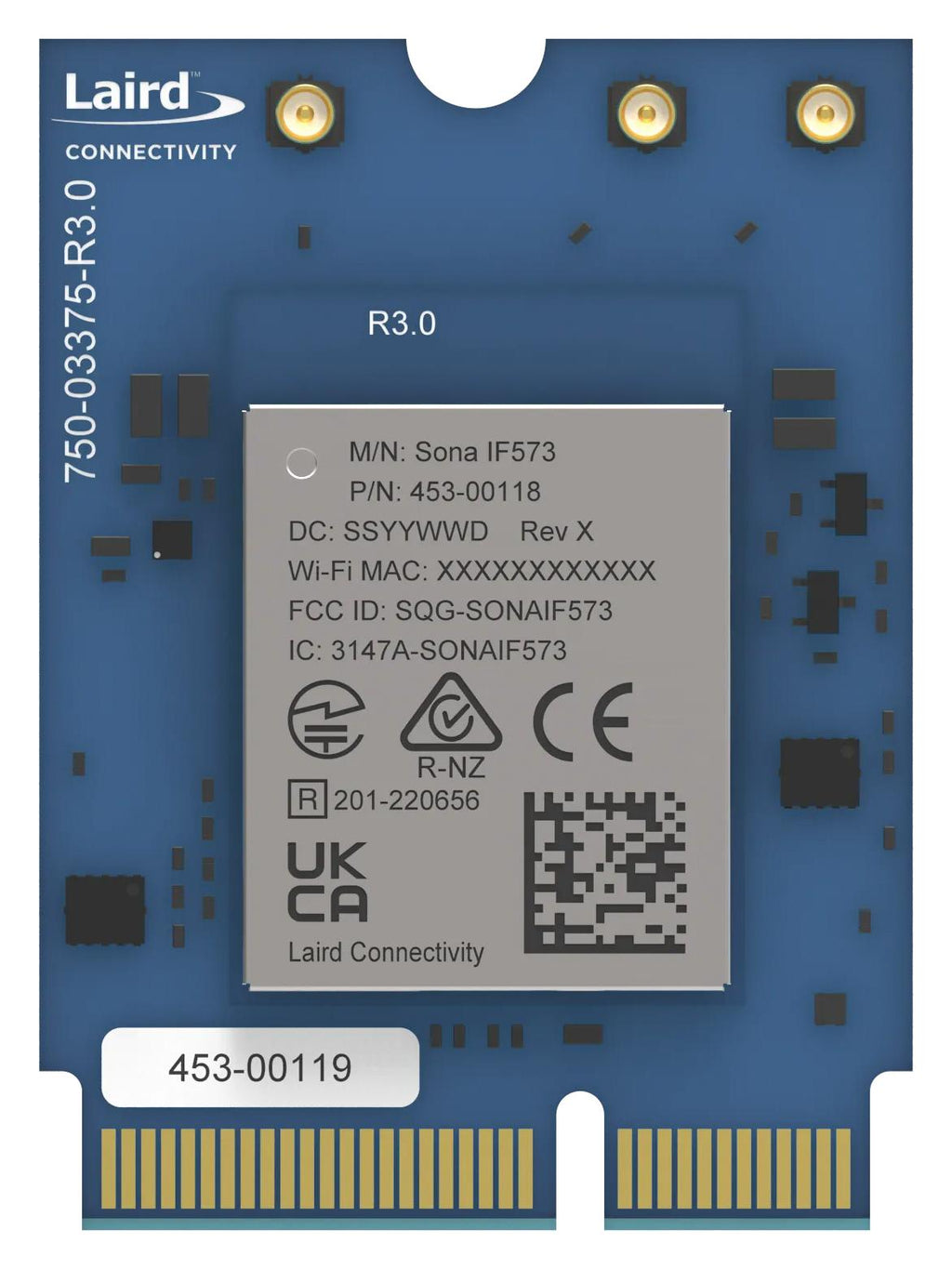 453-00119 is a Sona IF573 series embedded module. It is an integrated, small form factor Wi-Fi/Bluetooth module that is optimized for low-power mobile devices, featuring Wi-Fi 6E: Tri-band 2x2 MIMO IEEE 802.11a/b/g/n/ac/ax WLAN and Bluetooth® 5.4: dual mode. The integration of all WLAN and Bluetooth functionality in a single package supports low cost and simple implementation along with flexibility for platform-specific customization. This device is pre-calibrated and integrates the complete transmit/receive RF paths including bandpass filter, diplexer, switches, reference crystal oscillator, and power management units (PMU). The device has a dedicated Bluetooth port for best Wi-Fi + Bluetooth coexistence performance. The deviceâ��s low power consumption, radio architecture and power management unit (PMU) proprietary power save technologies allow for extended battery life.