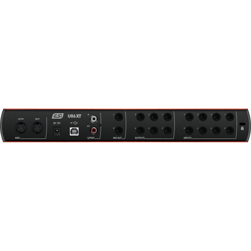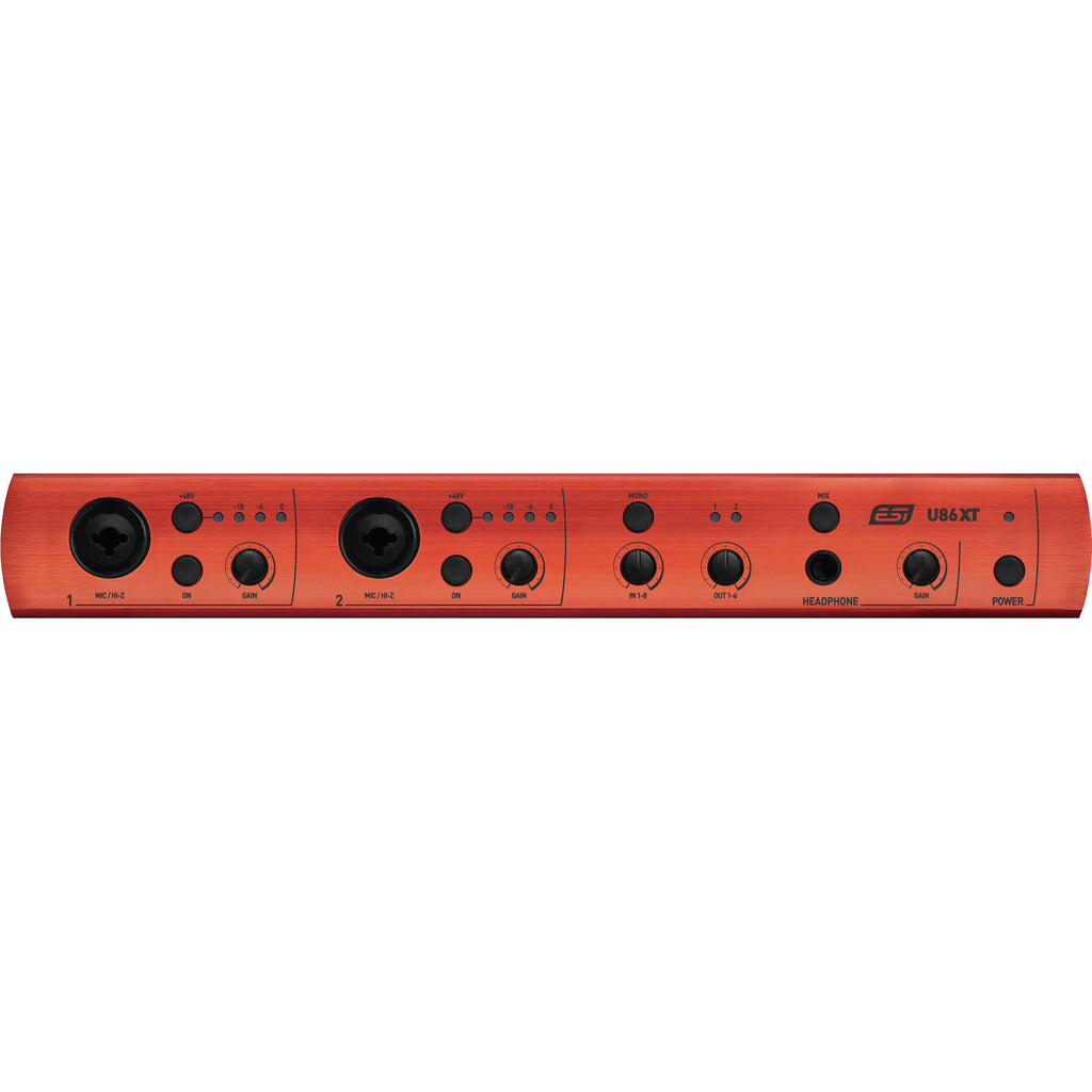 The ESI U86 XT is an audio interface that communicates to your Mac or Windows computer over USB. A total of eight inputs and six outputs are provided at any one time. Analog connections can be made through the preamp, which can handle microphone and Hi-Z sources, or by means of the line jacks on the rear panel. Condenser microphones can be powered via onboard +48V phantom power.