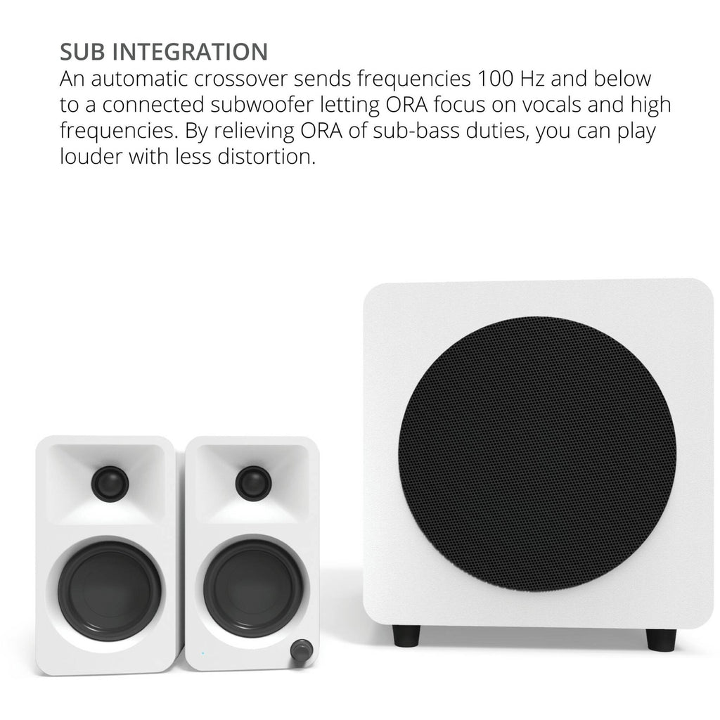 Experience studio-grade audiophile-quality sound from your computer, when adding this pair of ORA 2-Way Active Wireless Reference Desktop Speakers (Matte White) from Kanto Living to your desktop. They are an ideal solution for content creators, musicians, and gamers. Each speaker provides a 3" woofer and 0.75" silk dome tweeter that produces 50W total RMS sound, or 100W peak. Class-D bi-amplification is used for more dynamic sonic reproduction with an energy efficiency that results in minimal heat production. They connect to your PC or Mac via USB-C, but also offer RCA inputs for analog equipment, and an RCA sub out for optional subwoofer. Along with multiple wired options, Bluetooth is supported for mobile or smart home streaming.