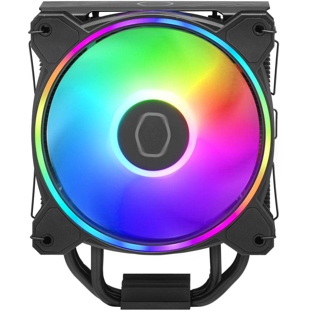 The black Cooler Master Hyper 212 Halo CPU Cooler features an MF120 HALO² RGB fan with enlarged fan blades for increase airflow and cooling performance. Intuitive LED detection automatically provides default ARGB spectrum lighting or full ARGB Gen 2 customization via a 3-pin header connection. Delivering up to 51.88 CFM of airflow at speeds of 650 to 2050 rpm. An aluminum heatsink ensures efficient heat dissipation. This CPU cooler is compatible with a range of Intel and AMD sockets.