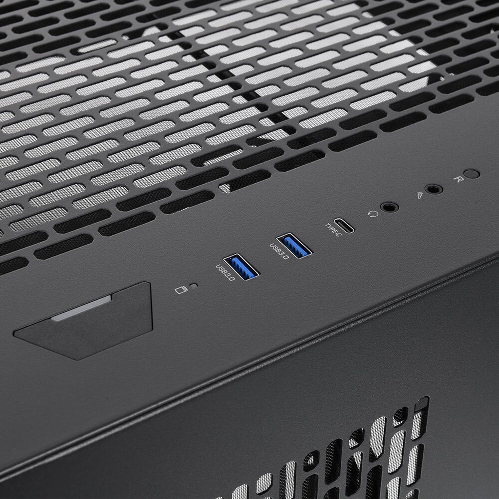 This case supports up to 420mm radiators on the bottom and motherboard side and 240mm radiators on the top, along with six 140 or 120mm fans on the bottom and motherboard side, with another two 120mm fans supported on the top. This ensures a wide range of configuration options for optimal cooling and aesthetics. The right-hand chamber provides optimized cable management including anchor points, hook-and-loop fasteners, and cable ties for keeping a neat and tidy look. The drive cage can support two 2.5 or 3.5" drives, while the driver plate can take two 2.5" SSDs or one 3.5" HDD. This chassis sports convenient I/O, including two USB-A 3.0 ports, one USB-C 3.2 port, and an HD audio jack, while the rear PCIe slots are rotatable for flexible GPU mounting. Finally, the chassis sports three fine removable dust filters, ensuring you always have clear airflow.