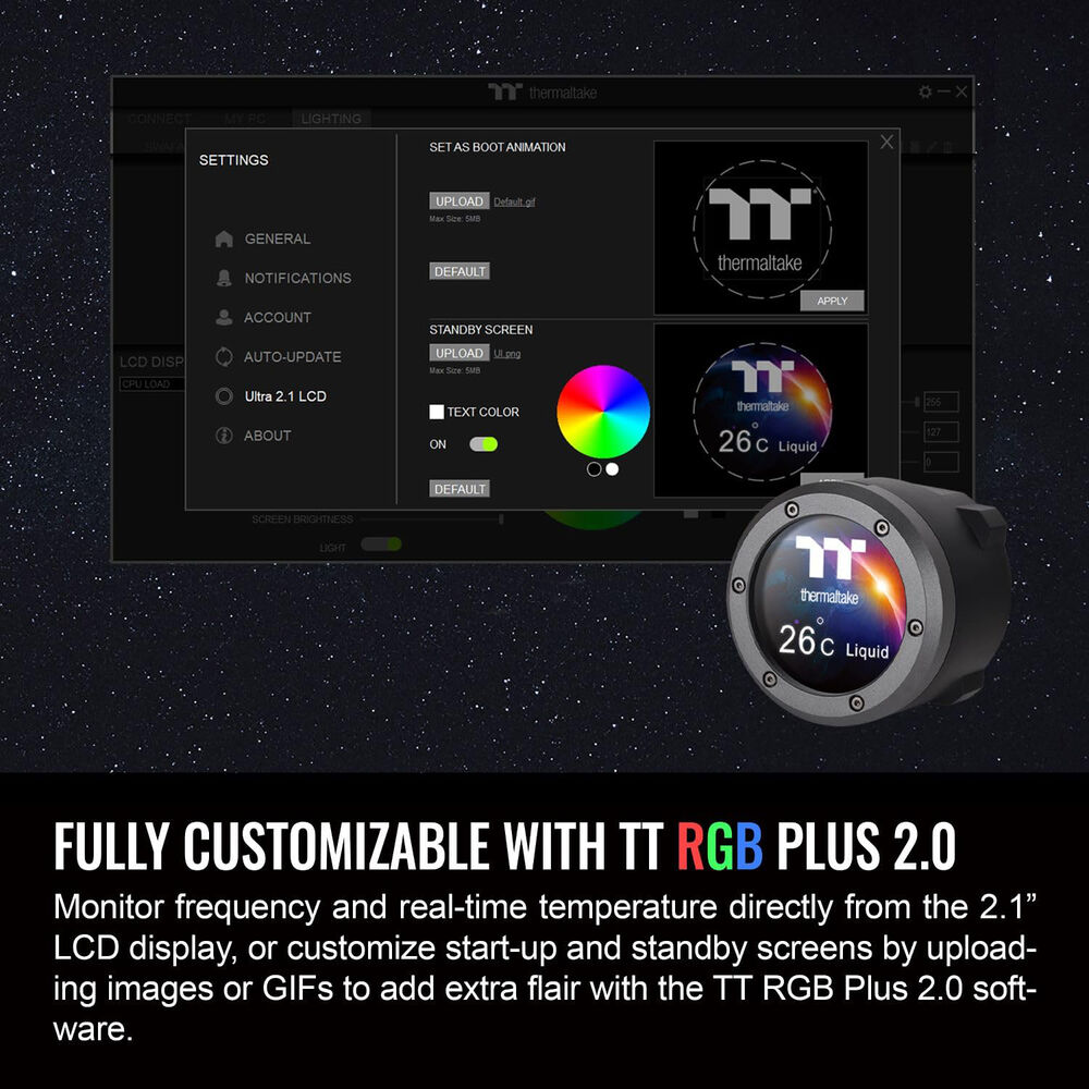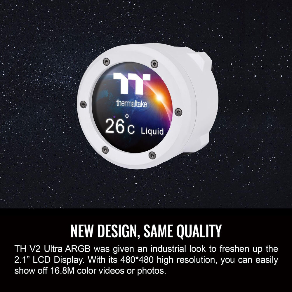 The Thermaltake TH420 Ultra ARGB Sync All-In-One Liquid Cooler is a high-performance cooling solution designed for medium to large chassis that can accommodate 420mm AIOs. This cooler is equipped with three enhanced CT140 ARGB fans, each capable of reaching speeds up to 1800 rpm, delivering an airflow of 84.32 CFM and a static pressure of 3.02mm-H2O, all while maintaining a noise level of 34.7 dBA. A standout feature of the TH420 Ultra is its industrial-style cap, which houses a 480 x 480 resolution LCD display. This display allows users to showcase 16.8 million color videos or photos, monitor real-time system information, or even display local time and weather updates, adding a personalized touch to your build. The cooler�s design includes a 27mm slim radiator with a 20mm thick copper chamber, enhancing cooling efficiency. For streamlined installation and improved cable management, the fans feature a daisy-chain design, reducing the number of required motherboard connections. The TH420 Ultra is compatible with the latest Intel and AMD CPU sockets, including Intel LGA1700 and AMD AM5.