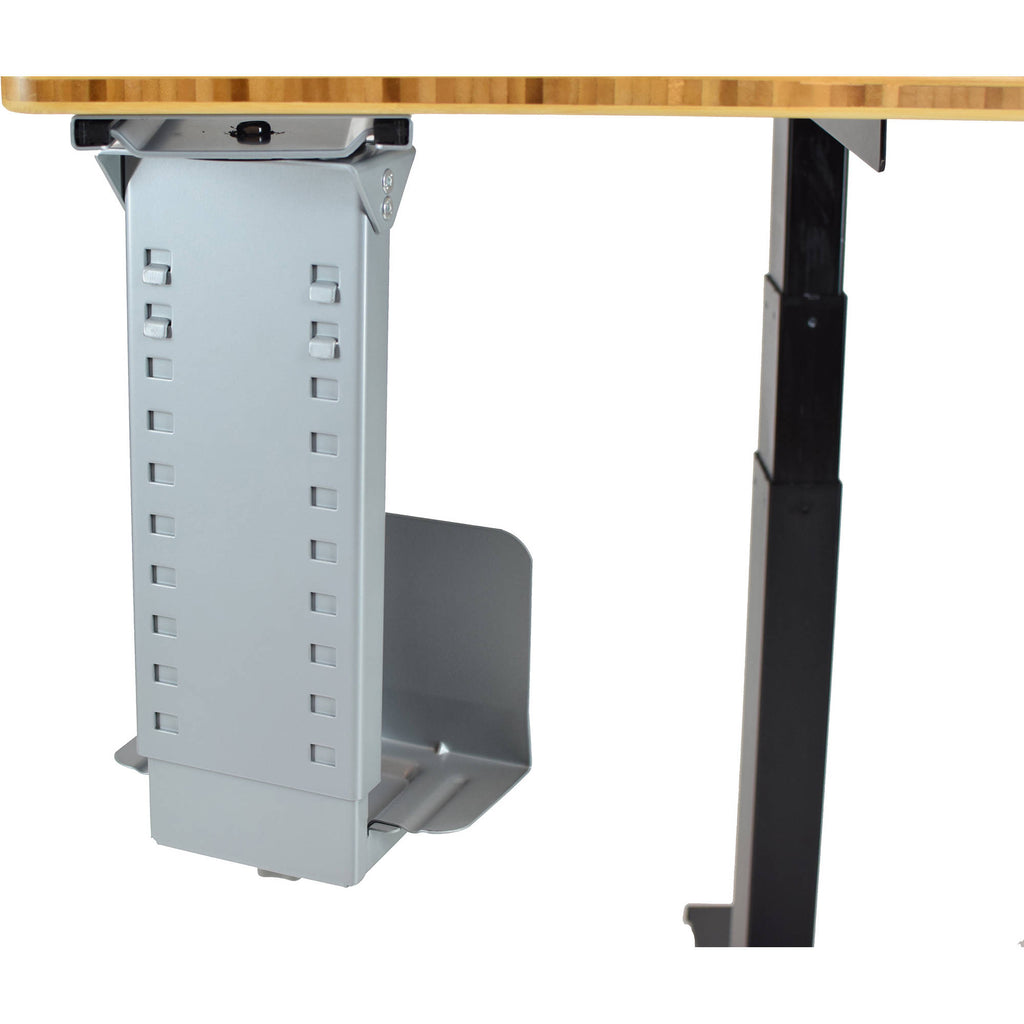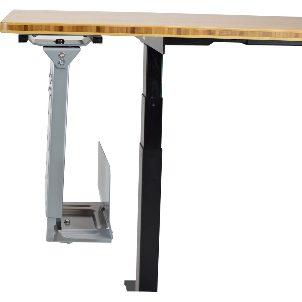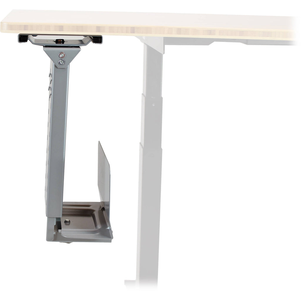 Mount a computer under your desk and swivel it around for easy access to ports and cables with the Under-Desk CPU Holder from Uncaged Ergonomics. This neutral gray steel mount attaches under a wooden desktop using a four-point mounting system, and it lets you swivel your CPU up to 360°. Ideal for standing desks, the mount's adjustable height and width is designed to fit most computer cases.