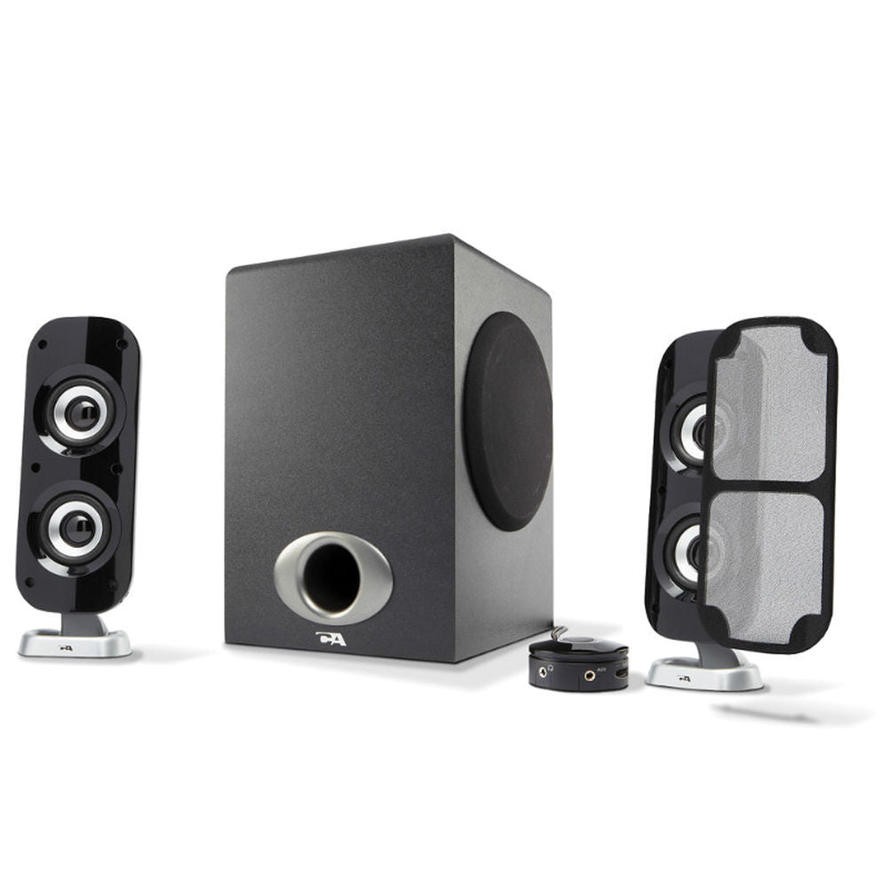 The CA-3810 2.1 Channel Powered Speaker System with Control Pod from Cyber Acoustics features two satellite speakers with 2" high-efficiency drivers as well as a subwoofer for premium audio. The system features an auxiliary input, bass volume control and headphone out jack for private listening. The satellite speakers are magnetically shielded to prevent interference from other electronic devices. Additional features include an on/off switch, master volume control and removable cloth grills.